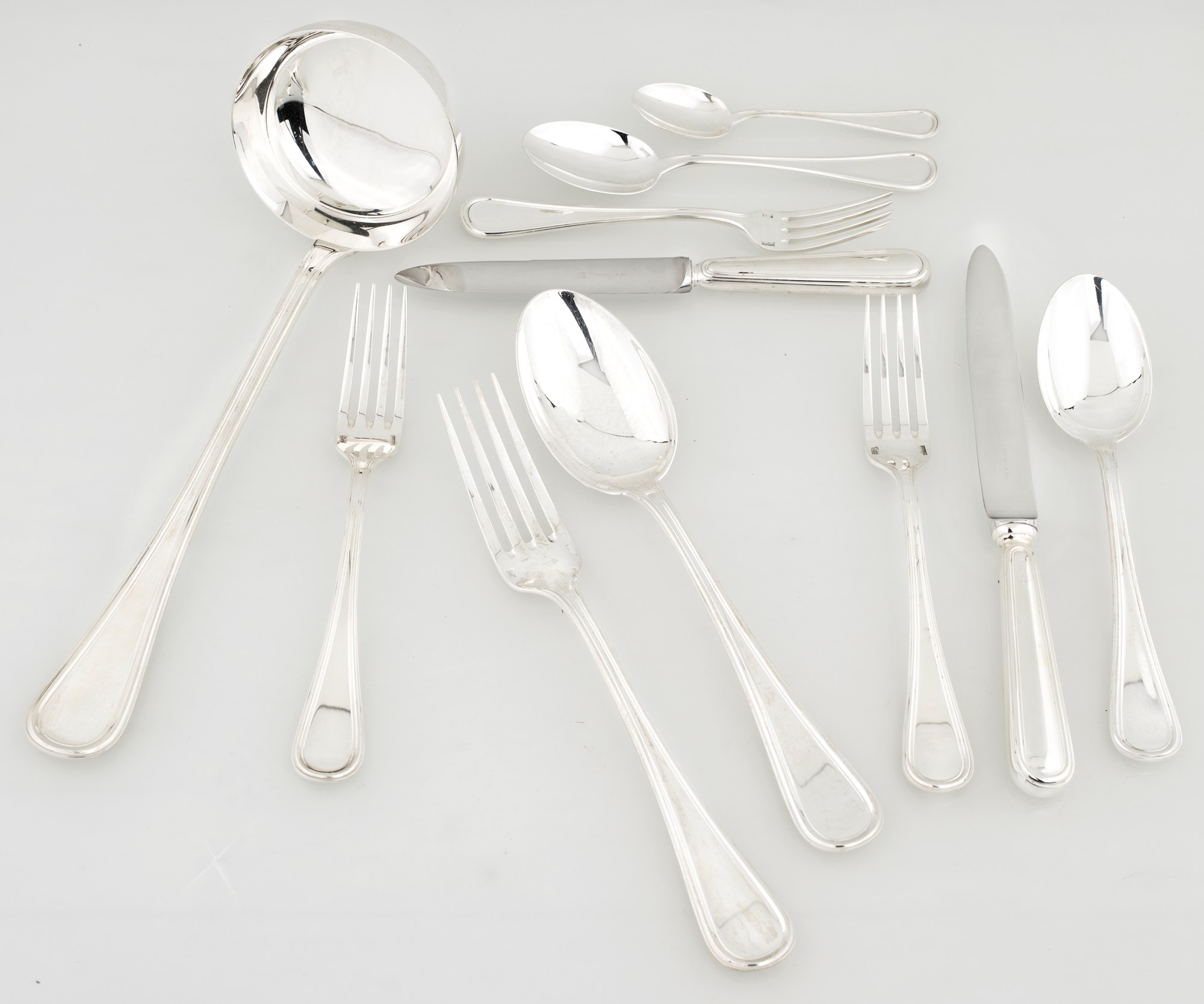 Servizio di posate per dodici in argento a titolo 800, argenteria Fornari con...