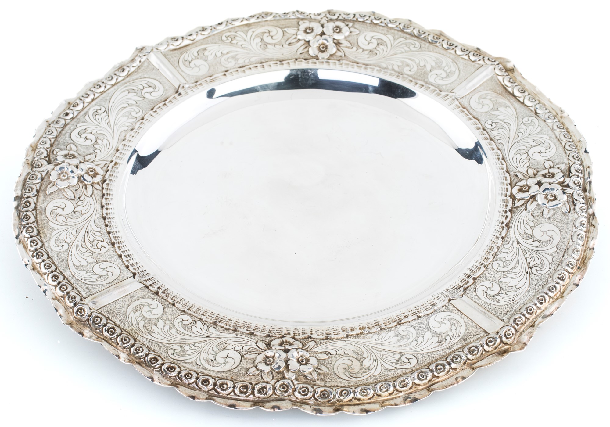Piatto in argento, fine XIX/inizio XX secolo di forma circolare con ampia tesa dal profilo curvilineo martellato e fitta decorazione a volute vegetali incise e corolle sbalzate diametro cm 31 - gr. 502