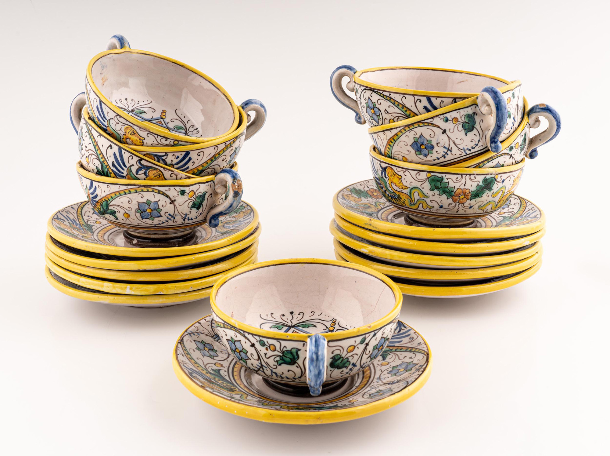 in maiolica policroma, composto da 9 tazze con piatto, teiera, lattiera, zuccheriera, portadolci e posacenere