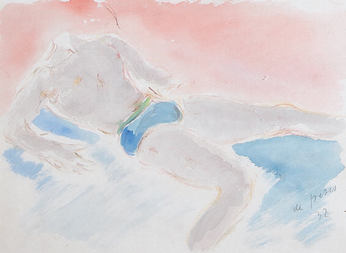 FILIPPO DE PISIS Ferrara 11/05/1896 - Milano 02/04/1956  Nudo maschile sdraiato, 1932 acquerello, sanguigna e matite colorate su carta cm. 23,4x32,2; firma e anno in basso a destra, opera registrata presso l'Archivio dell'Associazione per il patrocinio dell'opera di Filippo De Pisis al n° 03388 (foto smarrita), già asta Porro (MI) 2009.