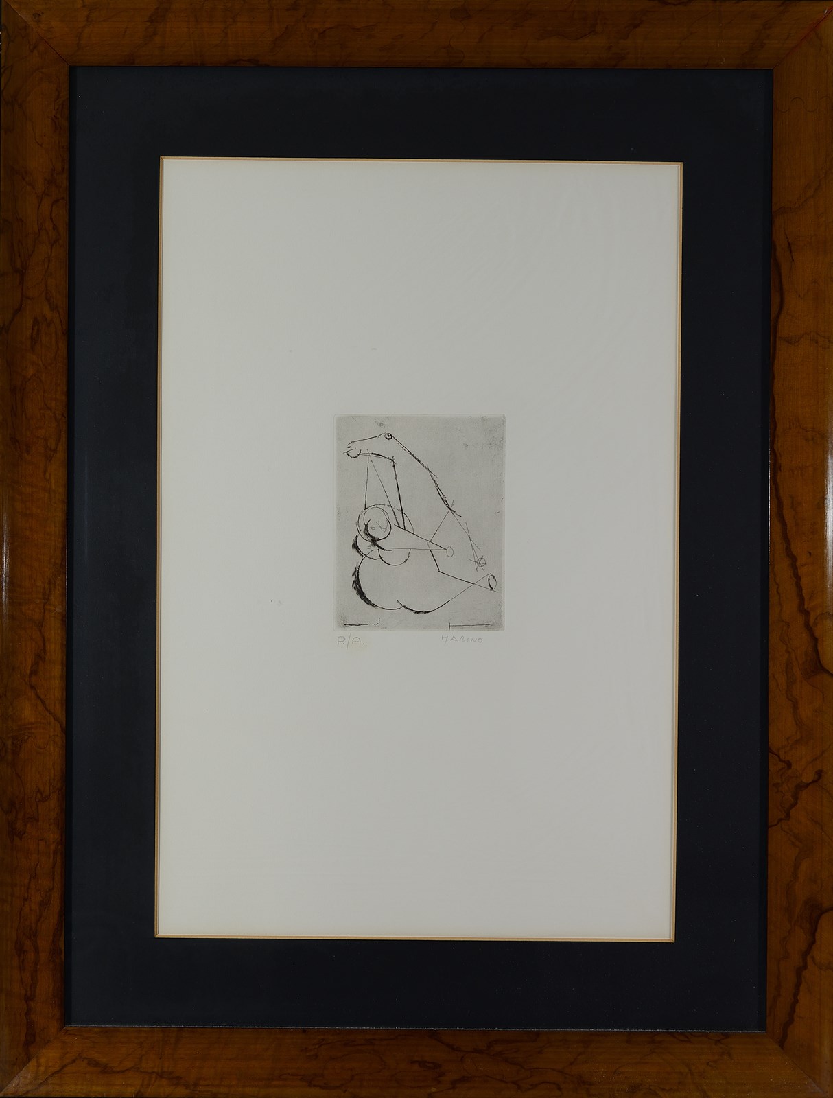 MARINI MARINO (1901 - 1980) Piccolo miracolo. 1972. Acquaforte, puntasecca. Cm 50,00 x 70,00. P.a. Firma e tiratura in basso a matita. Timbro a secco Stamperia Il Cigno, Roma, in basso a destra. Dimensione lastra: 15.5x12.3 cm. Editore: Albra, Torino, 1972. Edizione totale: 75 esemplari firmati e numerati da 1/75 a 75/75; 25 esemplari firmati e numerati da I/XXV a XXV/XXV +12 p.a. Pubblicazione: Marino Marini - Catalogo ragionato dell'opera grafica 1919-1980 a cura di Giorgio e Guido Guastalla, Edizioni Graphis Arte, pag. 216 tav. A149. . Cornice presente