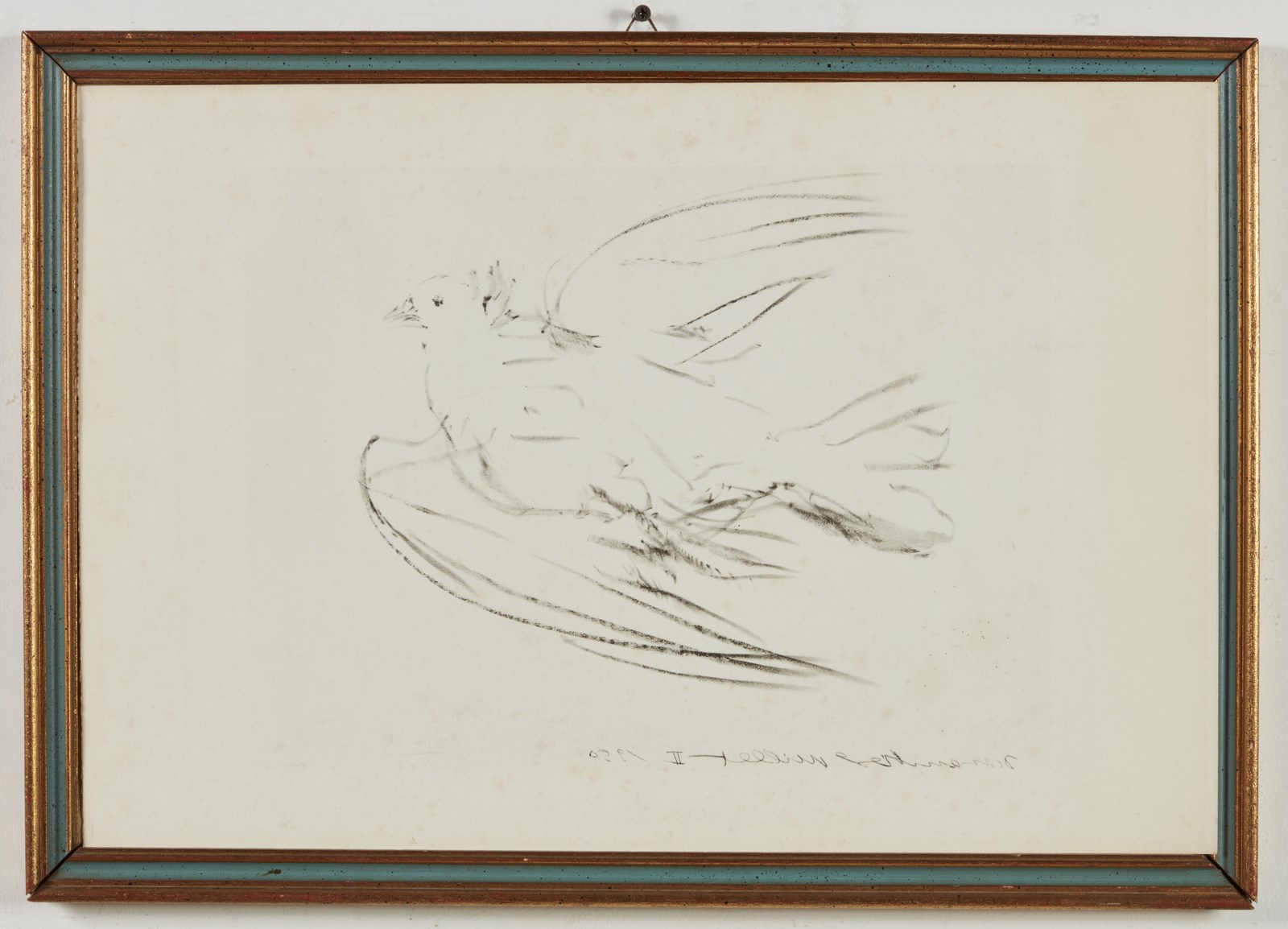 PICASSO PABLO (1881 - 1973) La colombe volante II. 1950. Litografia. Cm 52,00 x 36,00. P.d.a. Tiratura, firma, titolo e anno in basso in lastra. Dimensione lastra: 28x36.5 cm. Carta Arches, France. Edizione Totale: 50 esemplari numerati e firmati. Esposizione: Picasso, His Later Works, 1938-1961 (Worcester Art Museum, Worcester, 25 gennaio - 25 febbraio 1965). Pubblicazioni: Rich, Daniel Catton. Worcester. 1962. (35) Picasso, guerra i pau (Museu Picasso, Barcellona, 26 maggio - 26 settembre 2004).Ocaña, María Teresa, ed. Barcellona: Institut de Cultura de Barcelona, Museu Picasso. 2004. (267). Difetti. Cornice presente