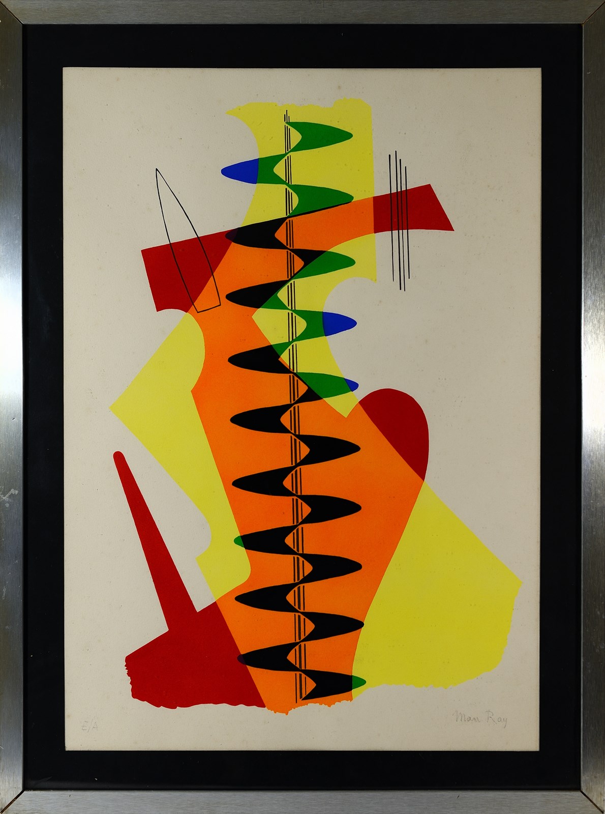 MAN RAY (1890 - 1976) Revolving doors: "The meeting". 1973. Litografia a colori. Cm 50,00 x 70,00. E.a. Firma e tiratura in basso a matita. Opera pubblicata nel 1973 dalla Galleria Il Fauno, Torino, in un'edizione di 100 esemplari + 10 copie su carta Giappone + 4 prove d'artista. Tra il 1916 e il 1917, Man Ray creò una serie di collages che denominò "Revolving Doors". I collages furono incorniciati e installati su un palo che lo spettatore poteva ruotare. I fogli originali, dopo la mostra personale alla Daniel Gallery di New York, nel 1919, furono distrutti. Man Ray li ha successivamente riprodotti in una serie di stampe a stencil pubblicate dalle Éditions Surréalistes di Parigi nel 1926 e dalla Galleria Il Fauno, Torino nel 1973. Cornice presente