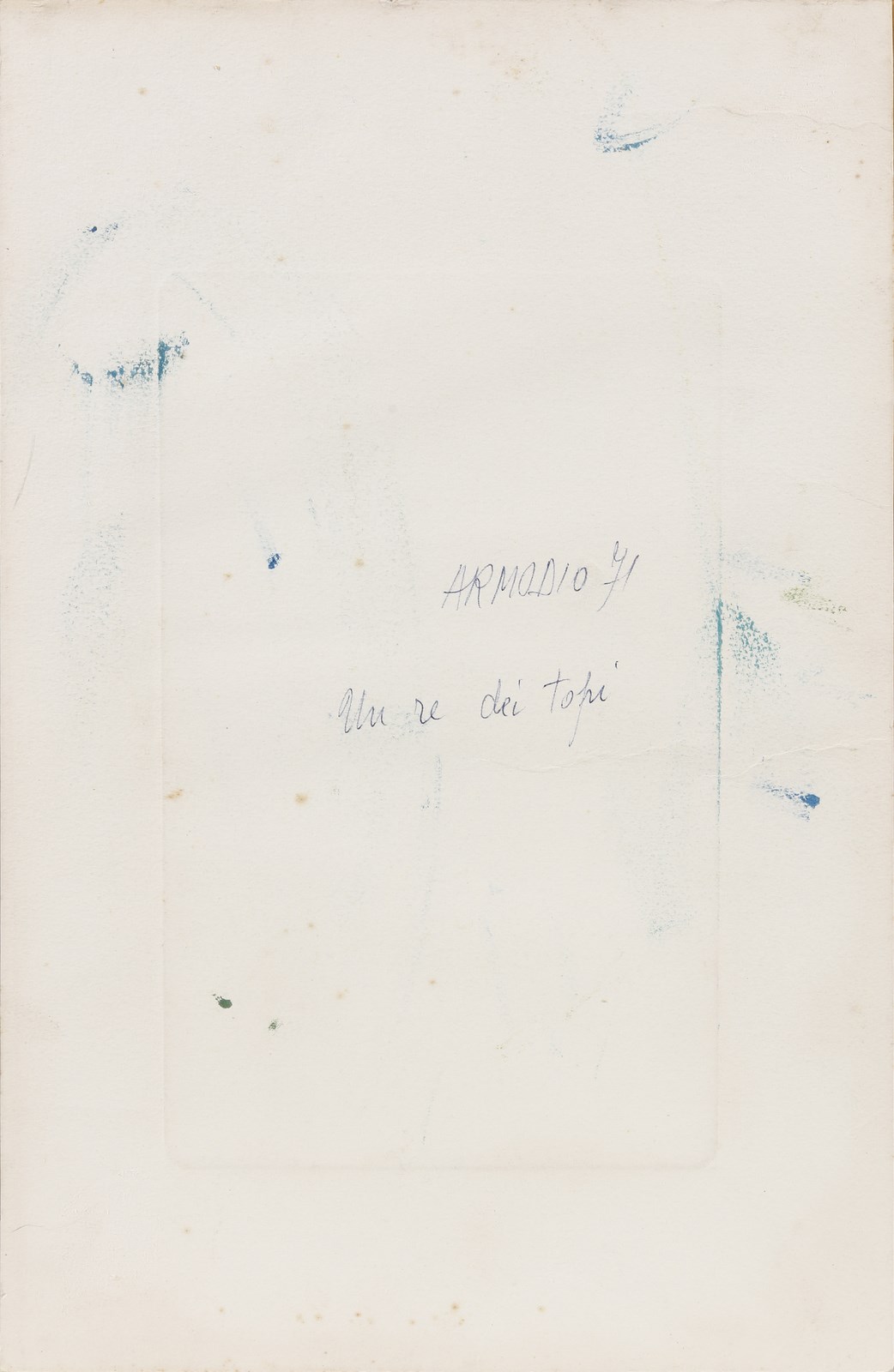ARMODIO (VILMORE SCHENARDI) (n. 1928) Un re dei topi. 1971. Calcografia ritoccata a mano. Cm 25,00 x 38,00. Firma e anno in basso al centro. Al retro titolo, firma e anno. Difetti. Cornice presente