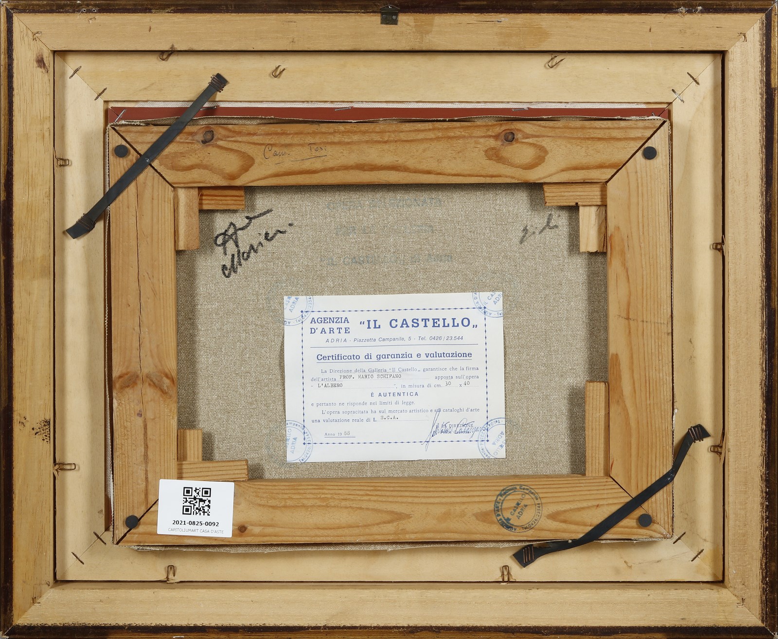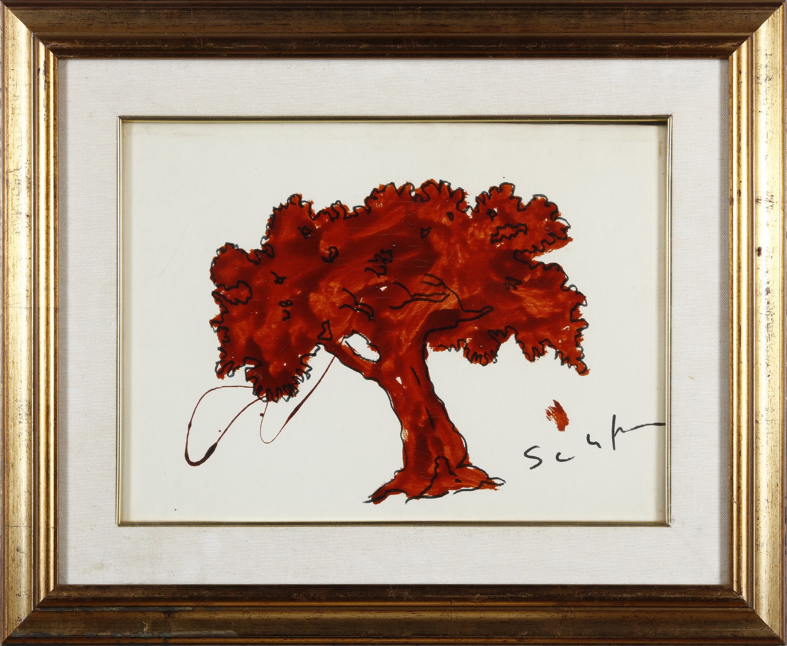 SCHIFANO MARIO (1934 - 1998) Albero. Oleografia. Cm 40,00 x 30,00. Firma in basso a destra. Al retro cartiglio descrittivo e timbri Galleria Il Castello, Adria. Certificato di autenticità Il Castello, Adria. Edizione non presente. Cornice presente