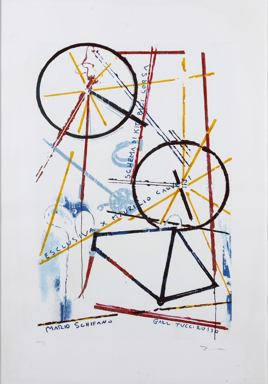 SCHIFANO MARIO (1934 - 1998) Schema di Kit bici da corsa. 1997. Serigrafia materica a smalto su carta. Cm 70,00 x 100,00. XXXIV/L. Tiratura e firma in basso a matita. Certificato di garanzia Telemarket. Difetti.