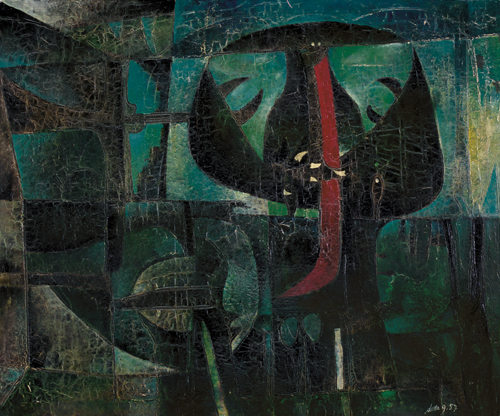 GIANNI DOVA Roma 08/01/1925 - Pisa 1991 Personaggio in finestra, 1957 olio su tela cm. 50x60, firma e anno in basso a destra, titolo, firma, anno e timbri della Raccolta Aldo (VE) al retro, opera registrata presso l'Archivio Gianni Dova al numero 591 come da dichiarazione della Galleria Cafiso (MI) su foto.