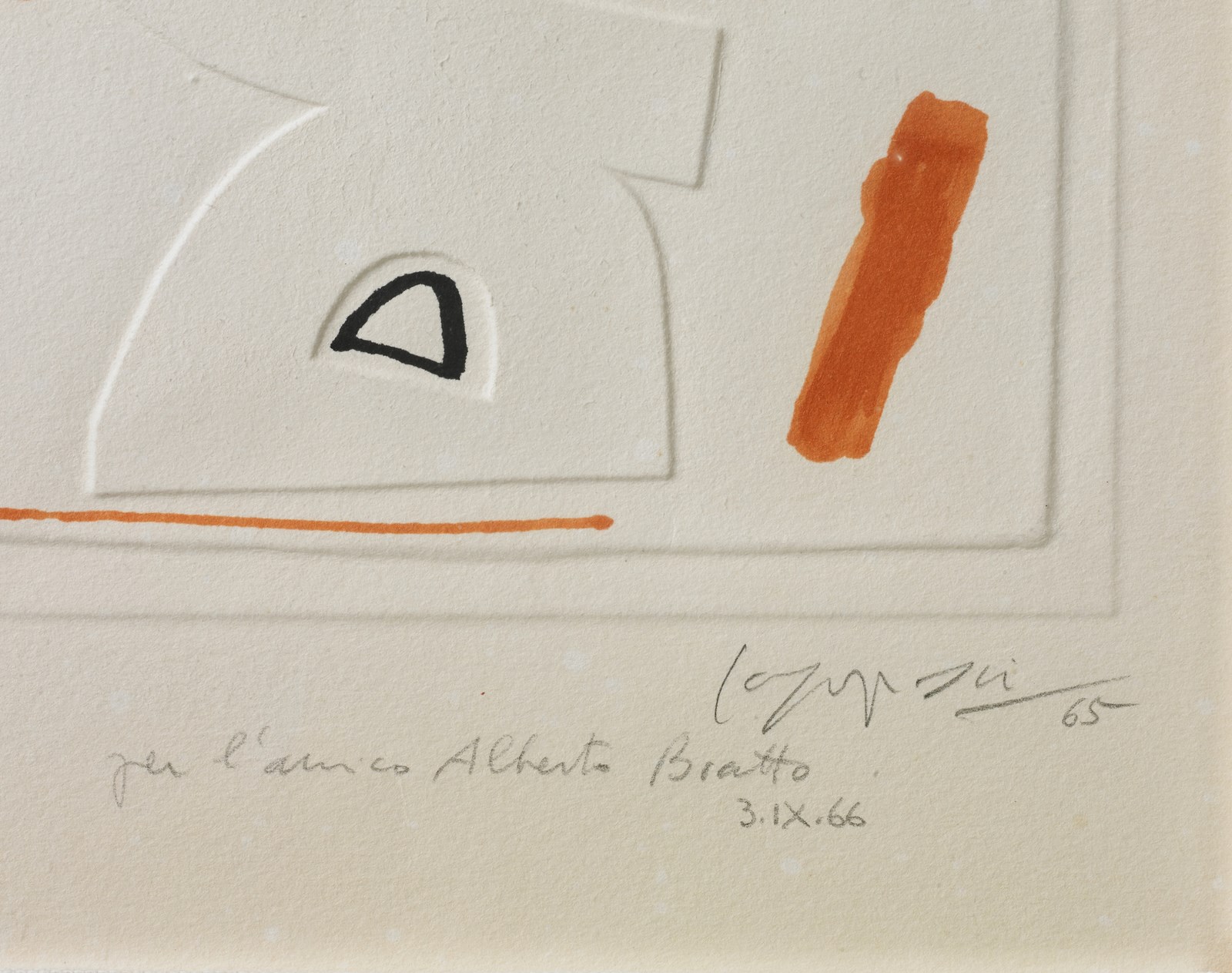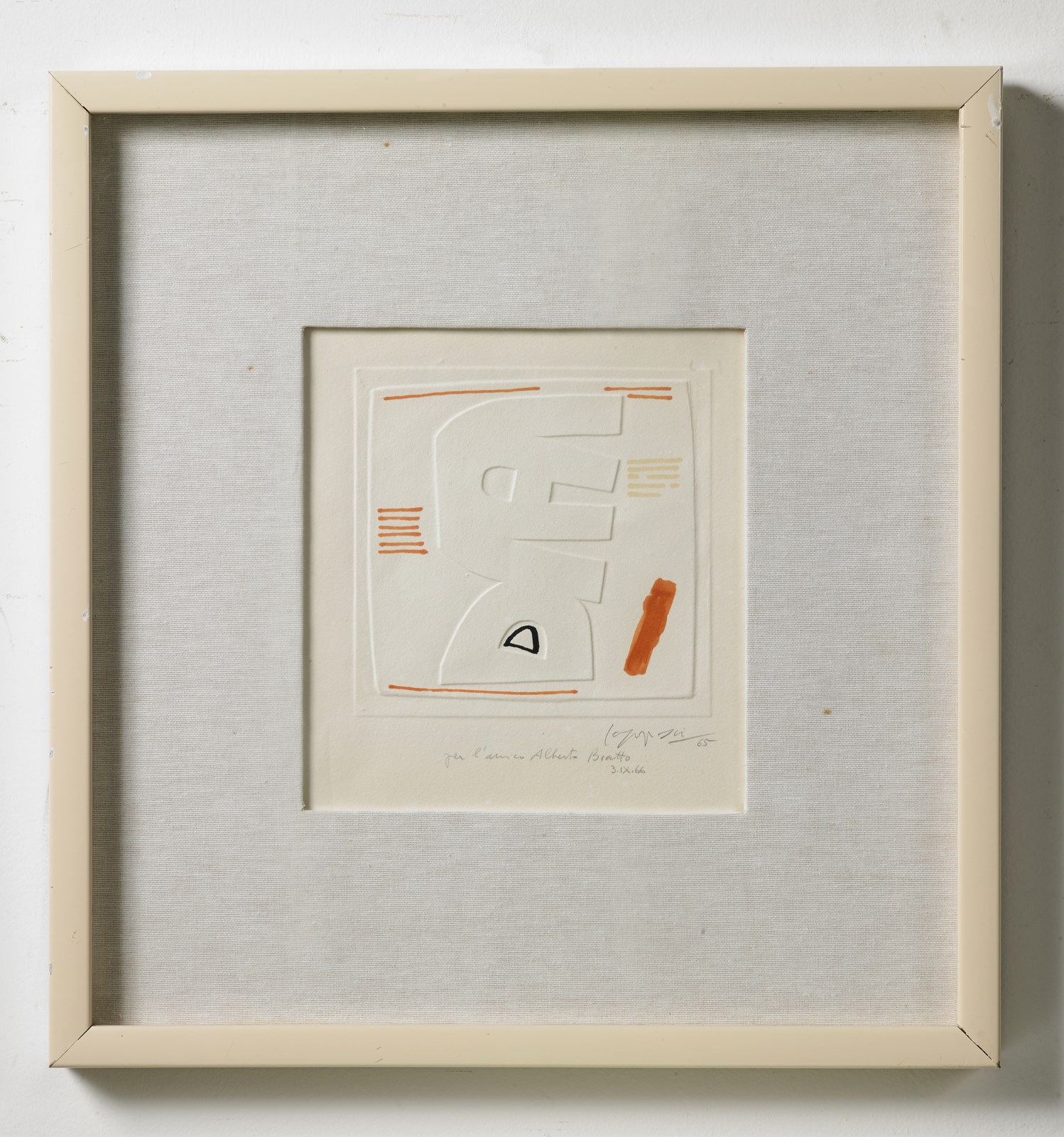 CAPOGROSSI GIUSEPPE (1900 - 1972) Superficie 466/Tm. 1965. Tecnica mista su carta litografica a rilievo. Cm 24,50 x 26,30. Firma, dedica e anno a matita in basso a destra. Dimensione lastra: 16x16 cm. Opera archiviata presso la Fondazione Giuseppe Capogrossi, Roma, come da documentazione fotografica allegata all'opera riportante il relativo numero d'inventario.