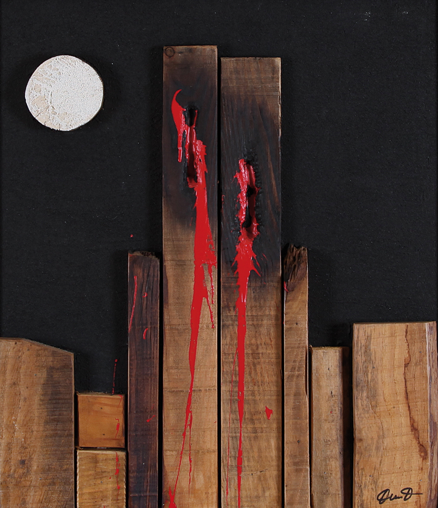 PIERLUIGI DE LUTTI Monfalcone 1959 Doppia ferita tecnica mista, acrilico, legni e combustioni su tavola cm. 70x60, firma in basso a destra, dichiarazione d'autenticità dell'artista su foto.