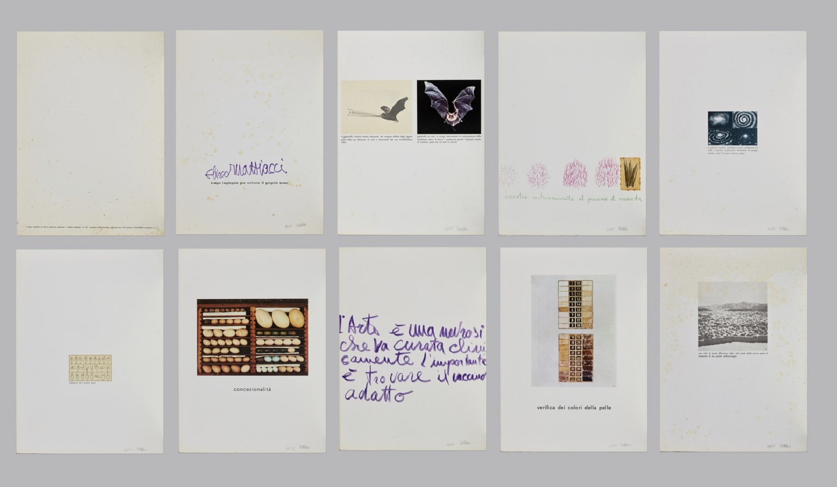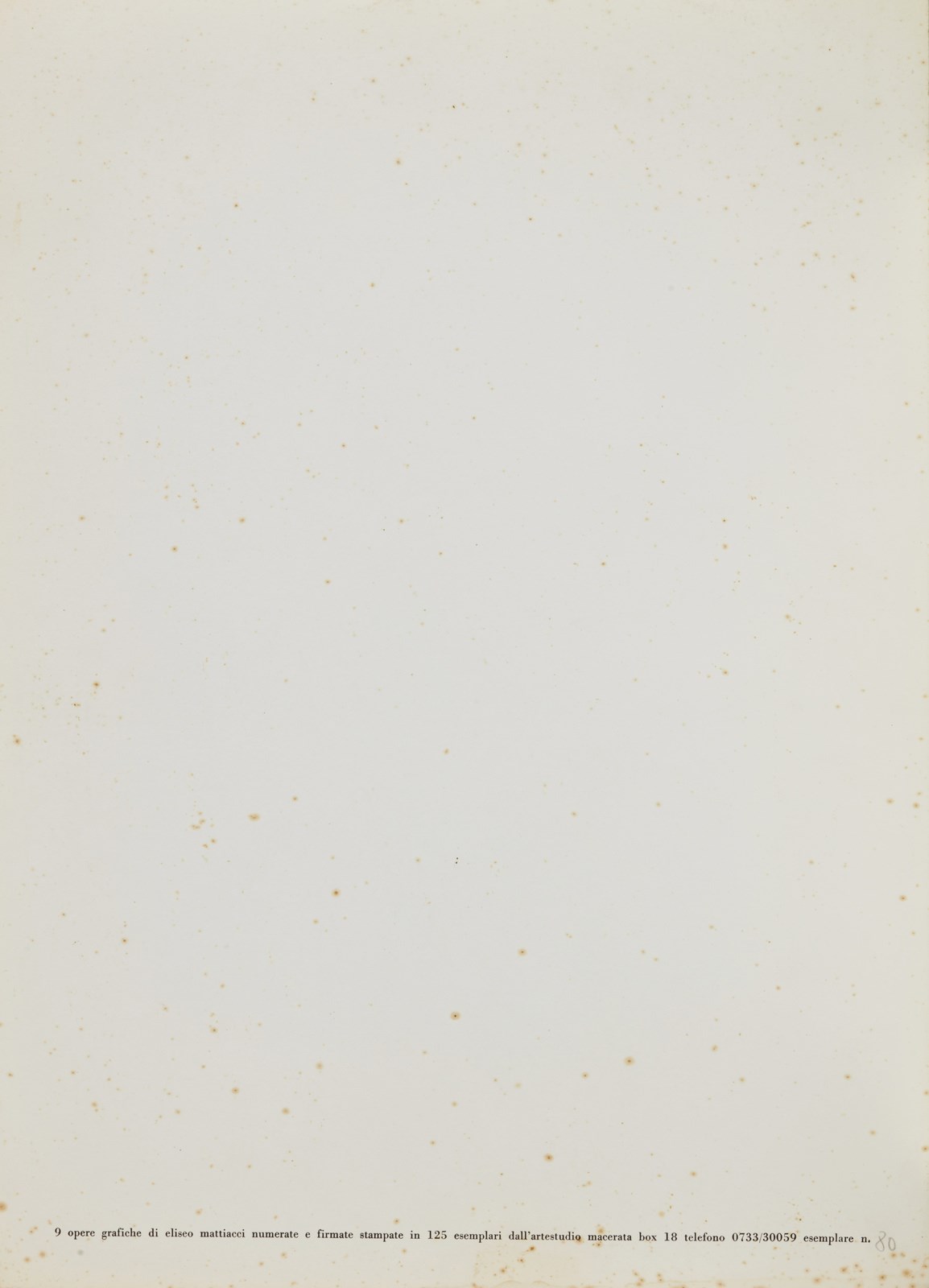 MATTIACCI ELISEO (n. 1940) Cartella composta da n.9 fogli. Senza titolo. Litografia. Cm 36,60 x 50,00. 80/125. Ogni grafica presenta tiratura e firma a matita in basso a destra. Difetti. Stampatore: Artestudio, Macerata. Edizione totale: 125 esemplari numerati dall'1 al 125. 1971-1972.