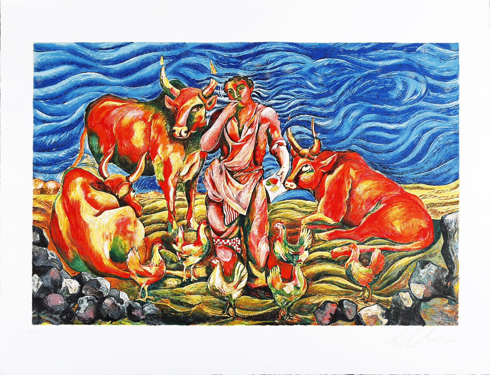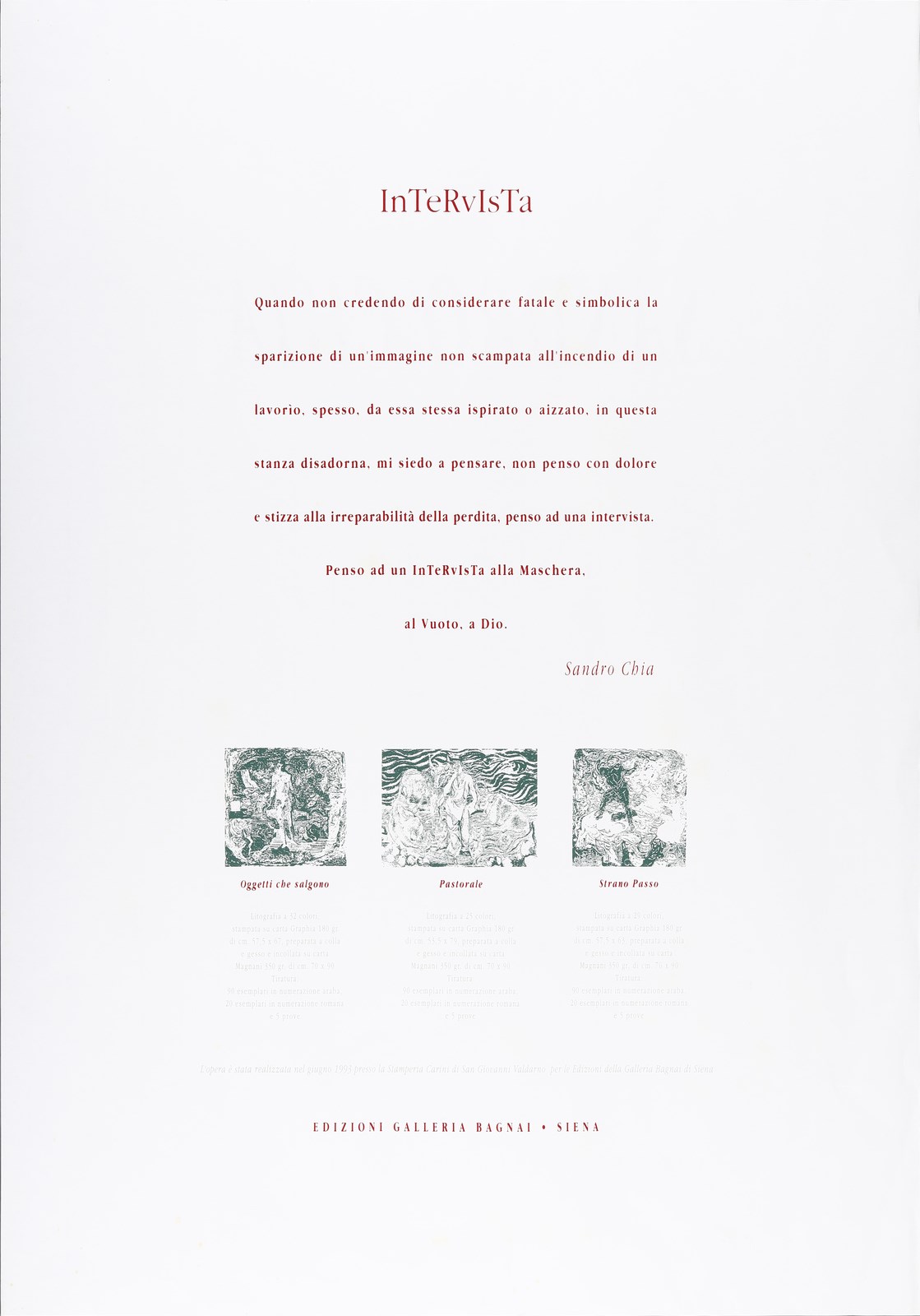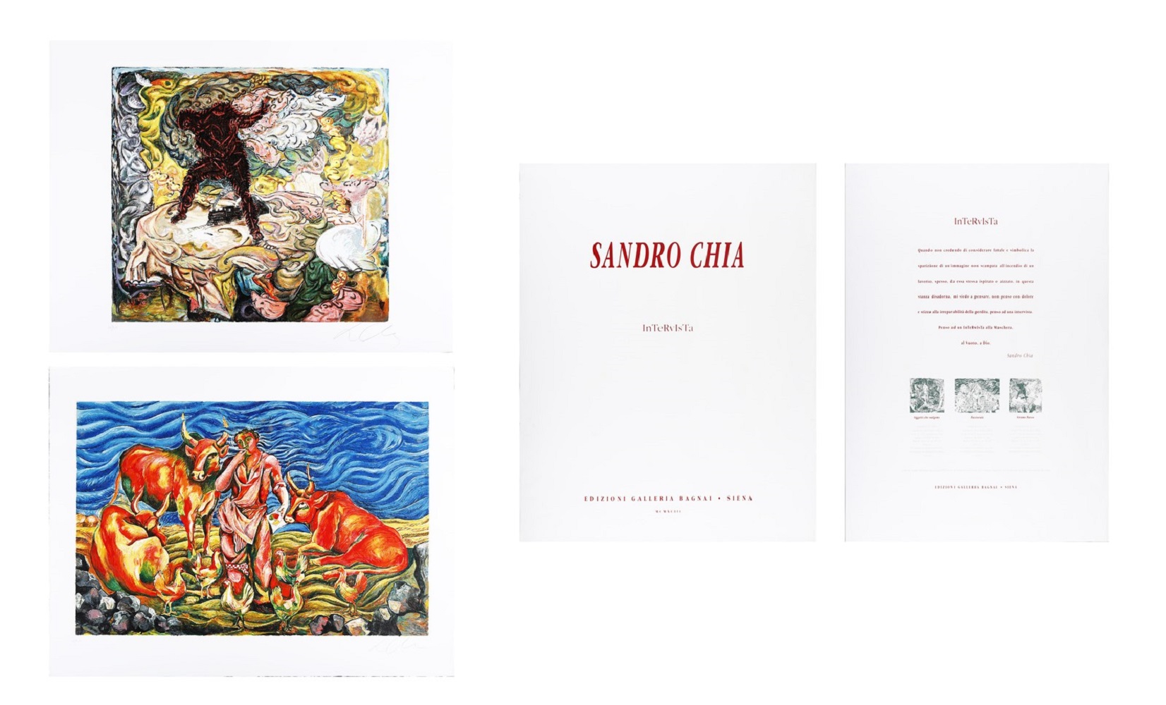 CHIA SANDRO (n. 1946) Cartella composta da n.2 fogli. Pastorale; strano passo. Litografia. Cm 70,00 x 90,00. 56/90. Ogni foglio presenta tiratura e firma in basso a matita. Edizione totale: 90 copie numerati da 1 a 90; 20 numerati da I a XX + 5 p.d.a. Carta Magnani 350 gr.