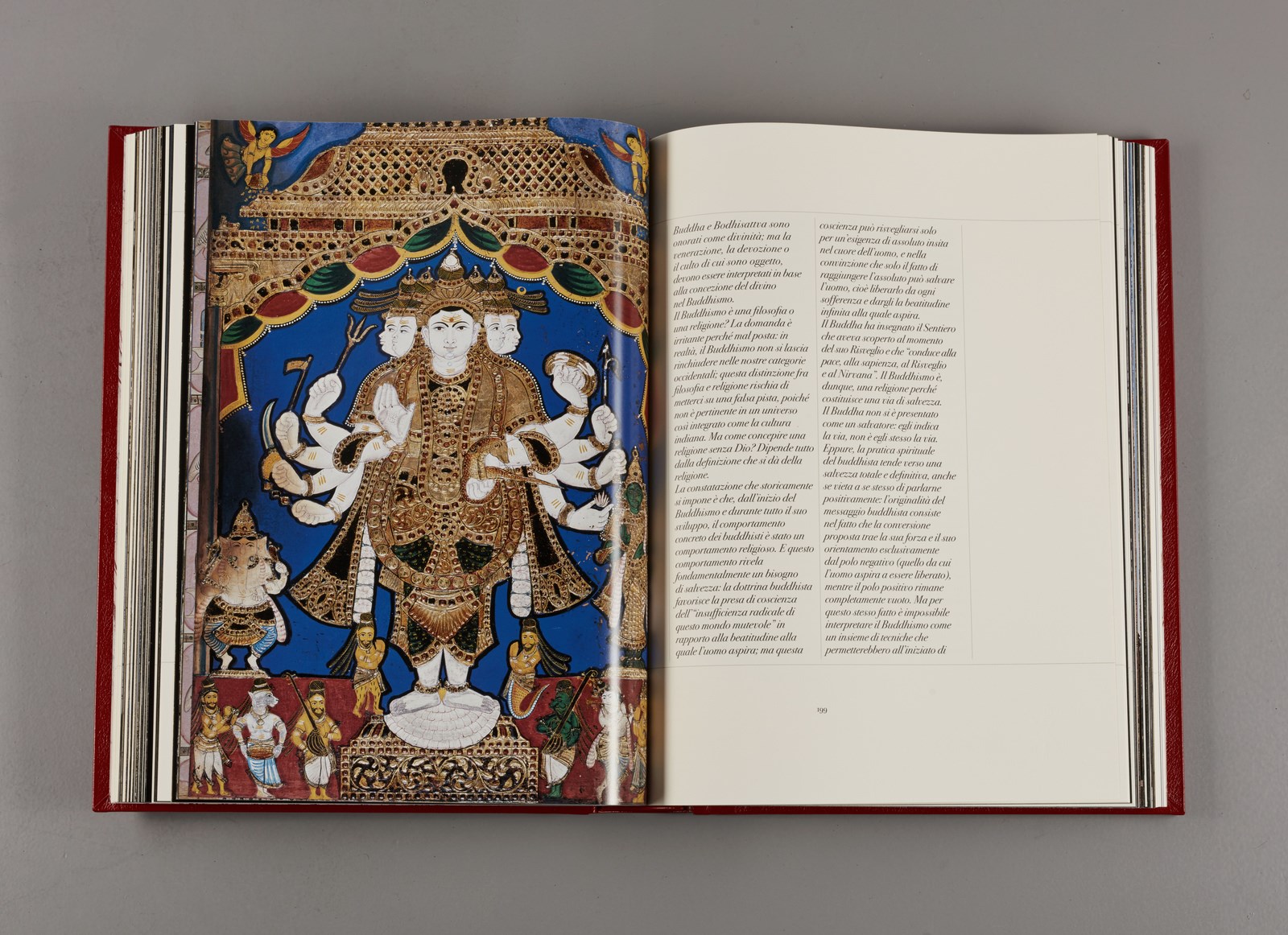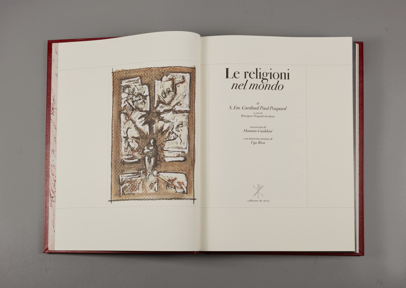 RIVA UGO (n. 1951) Le Religioni nel Mondo. Libro d'arte. Cm 33,00 x 47,00. 939/975. Edizione FMR. Certificato di Garanzia FMR- ARTE. Il volume Le religioni nel mondo di S. Em. Cardinal Paul Poupard è stato realizzato in edizione speciale a tiratura limitata. L’edizione è corredata da un'opera di Ugo Riva e da centocinquantatre fotolitografie stampate presso la stamperia di Jacopo Steffenini, Milano, su carta patinata prodotta dalle Cartiere del Garda di Riva del Garda. I testi sono stati stampati su carta velata, con filigrana Ars Sacra, fabbricata appositamente per questa edizione dalle Cartiere Magnani di Pescia.