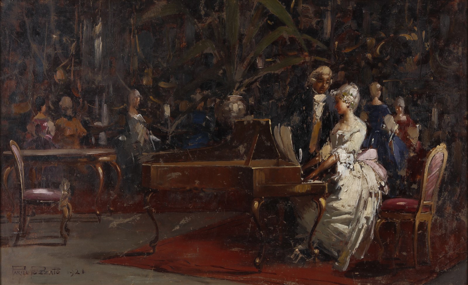 POZZATO PARIDE (1899 - 1971) Scena d'interno. 1921. Olio su cartone pressato. Cm 58,00 x 35,00. Firma e anno in basso a sinistra. Lievi difetti. Cornice presente