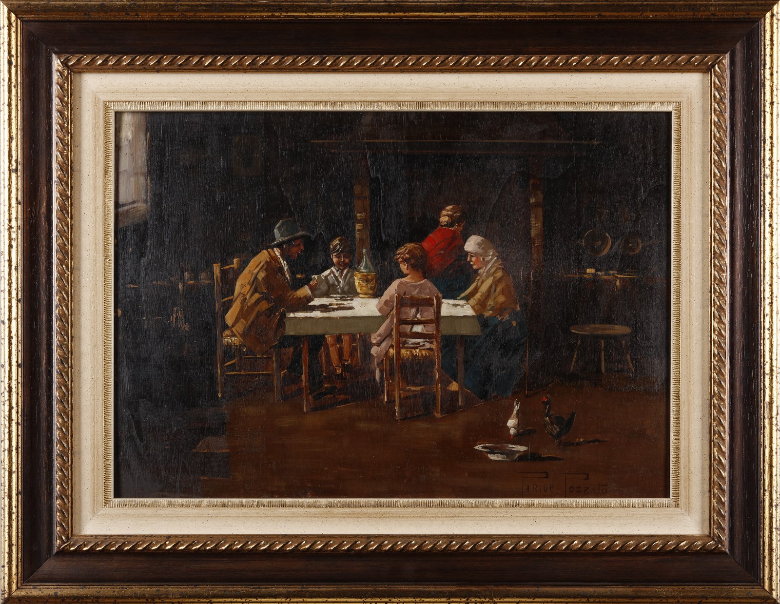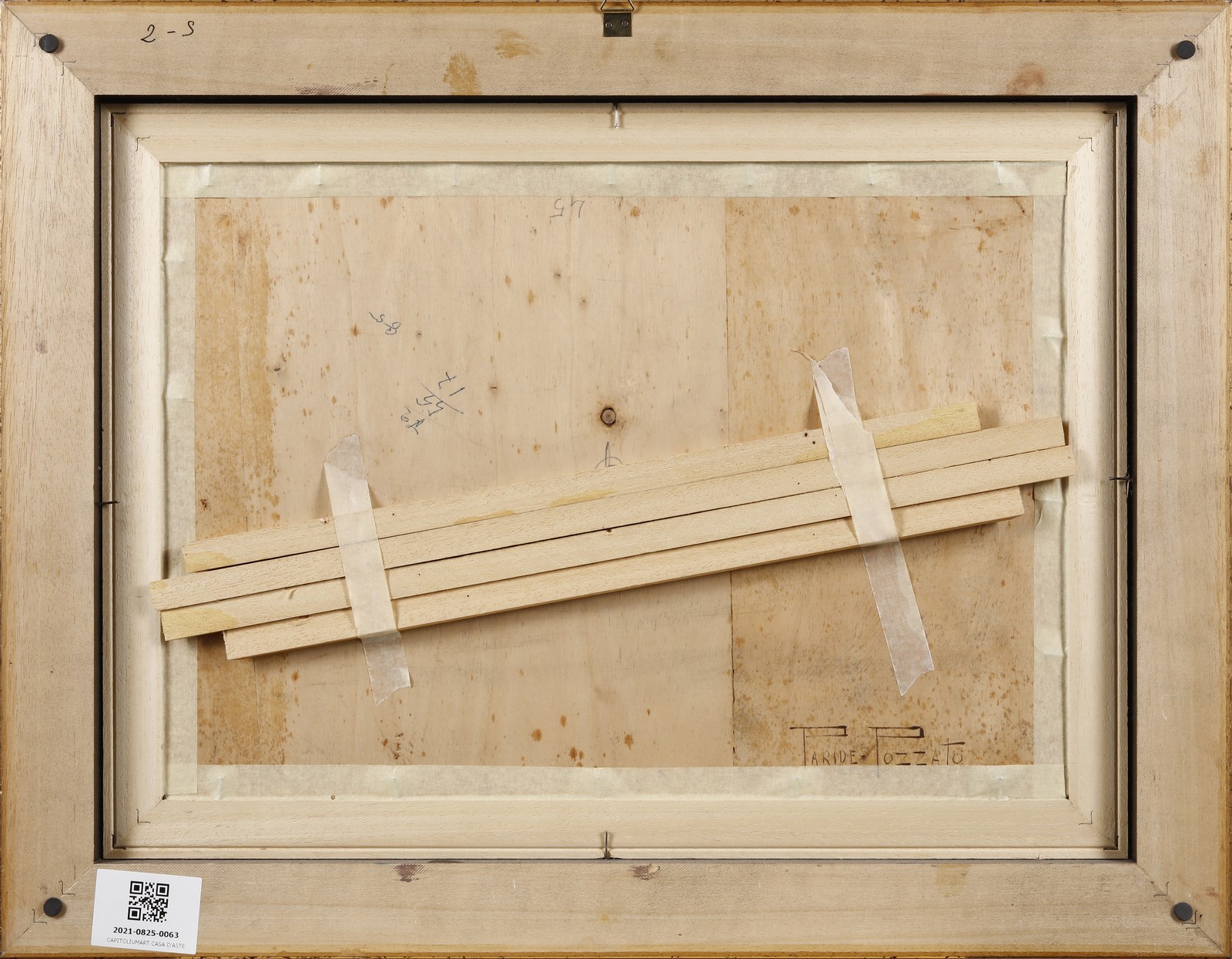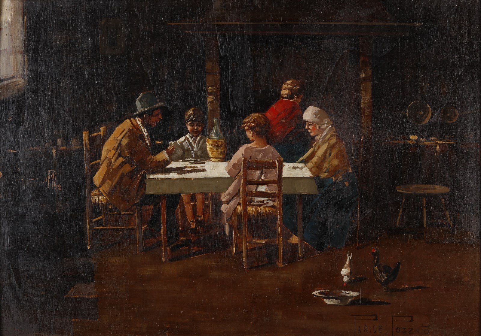 POZZATO PARIDE (1899 - 1971) Scena d'interno. Olio su tavola. Cm 46,00 x 32,00. Firma in basso a destra e al retro. Cornice presente