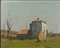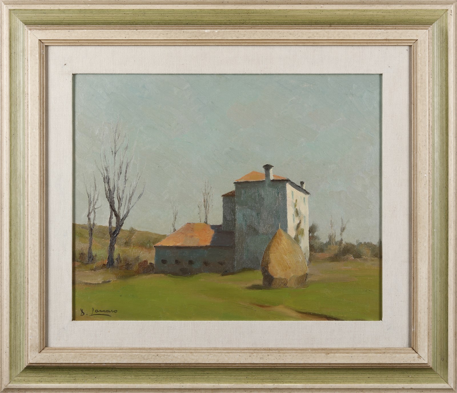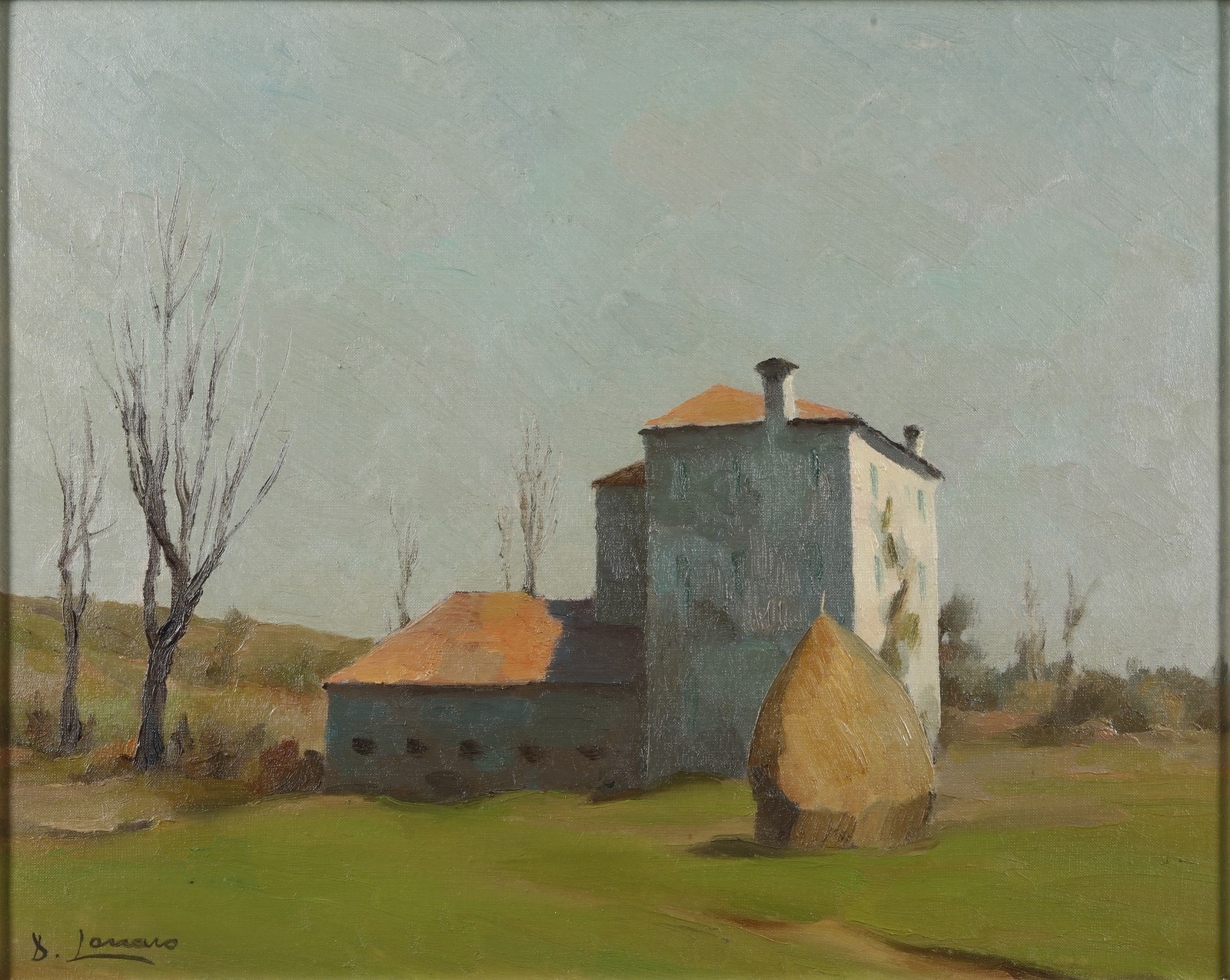 LANARO DINO (1908 - 1998) La grande fattoria. Olio su cartone intelato. Cm 50,00 x 40,00. Firma in basso a sinistra. Al retro titolo, firma e cartiglio dell'artista. Cornice presente