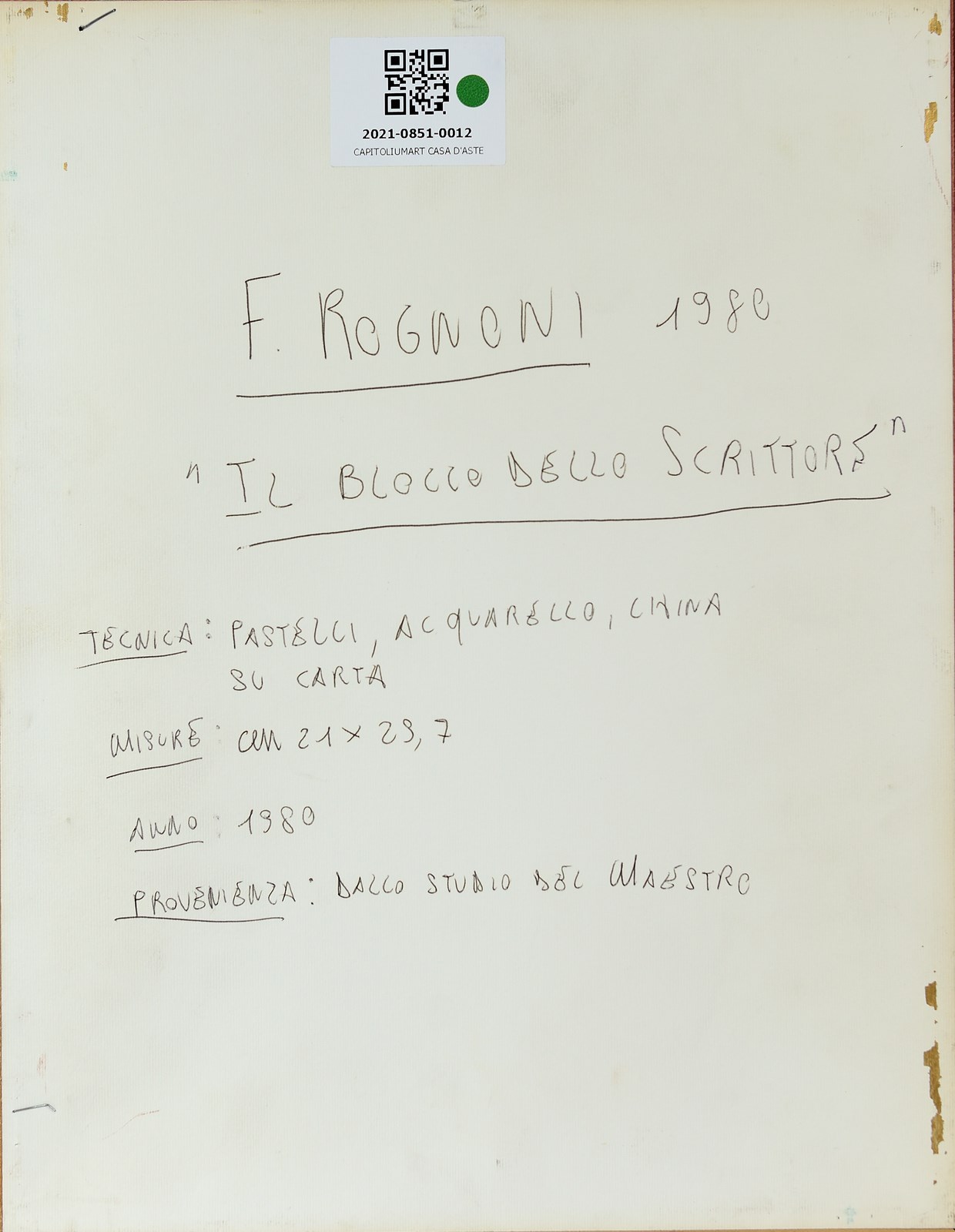 ROGNONI FRANCO (1913 - 1999) Il blocco dello scrittore. 1980. Tecnica mista su carta. Cm 29,70 x 21,00. Firma in basso a destra. Cornice presente