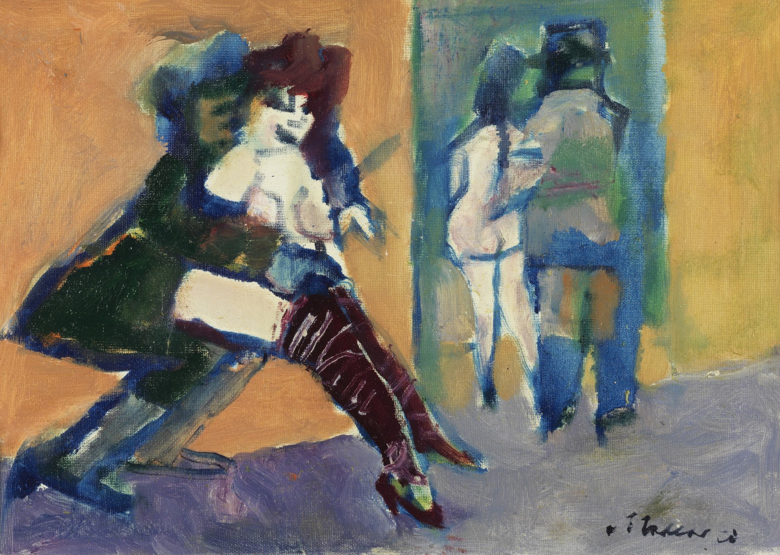 MACCARI MINO (1898 - 1989) Senza titolo. Olio su tela incollata su tavola. Cm 35,00 x 25,00. Firma in basso a destra. Opera archiviata presso l'Archivio Mino Maccari, Cinquale come da documentazione fotografica allegata all'opera riportante il relativo numero d'inventario. Anni 1975/1980. Presenti lievi difetti. Cornice presente