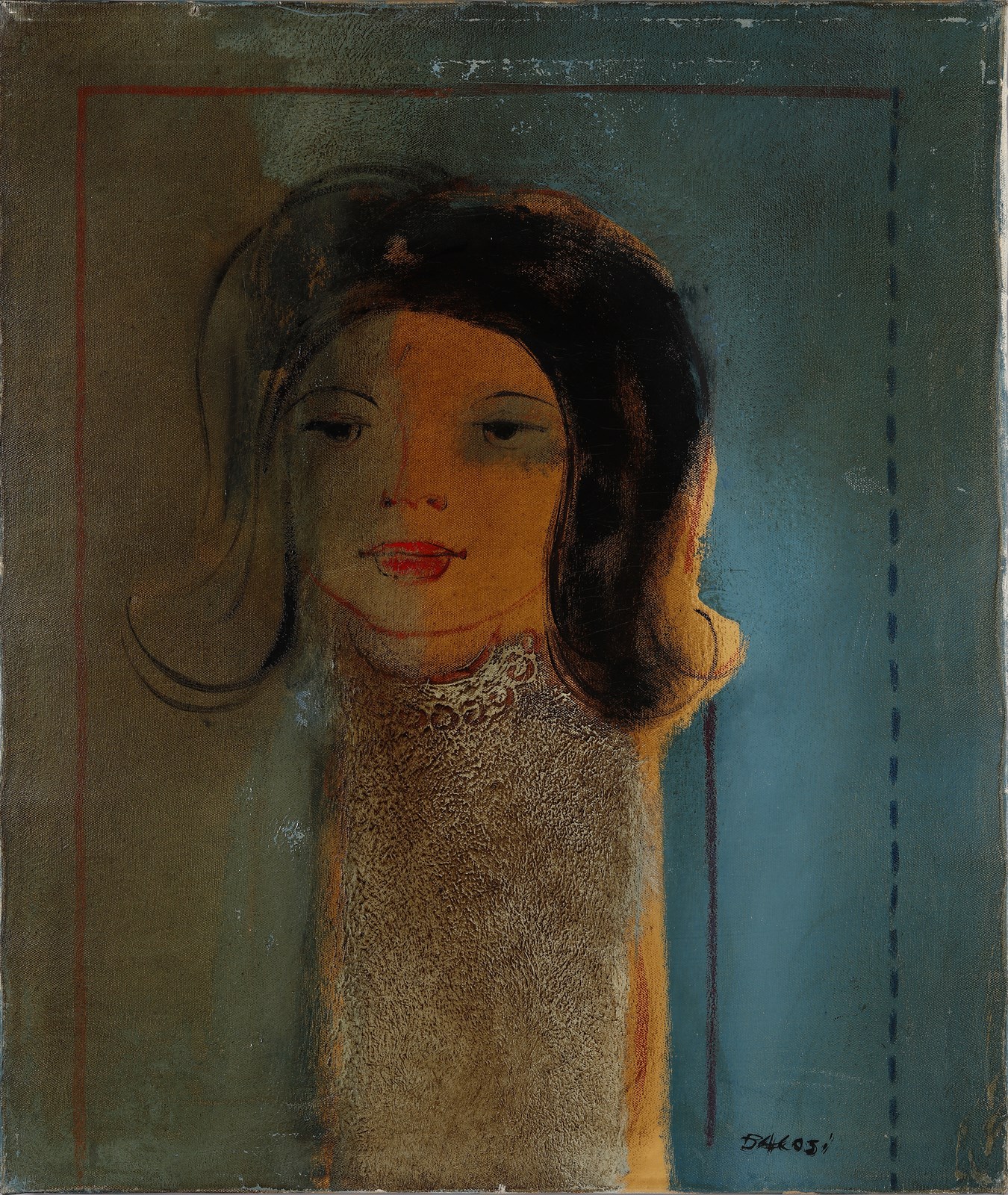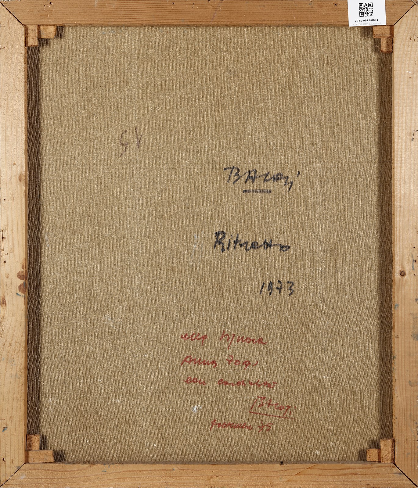 BACOSI MANLIO (1921 - 1998) Ritratto. 1973. Olio su tela . Cm 60,00 x 70,00. Firma in basso a destra. Al retro titolo, firma e anno. Difetti. Autentica dell'artista su fotografia.