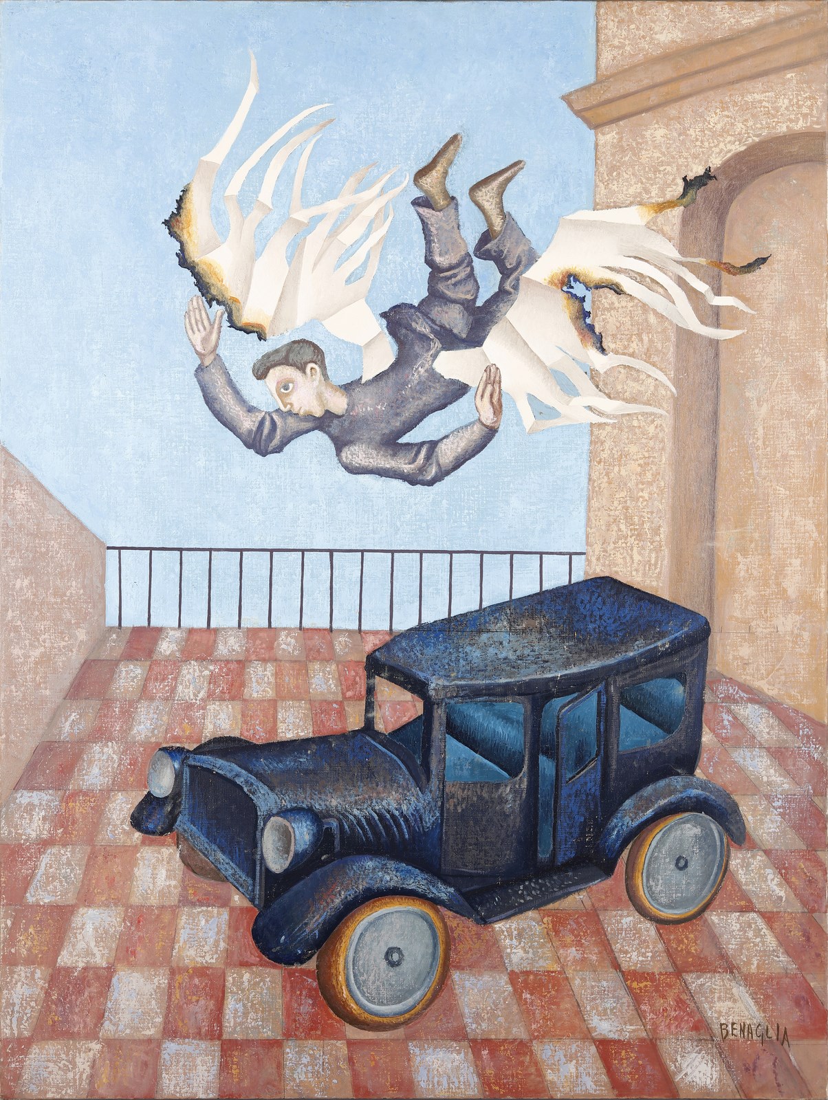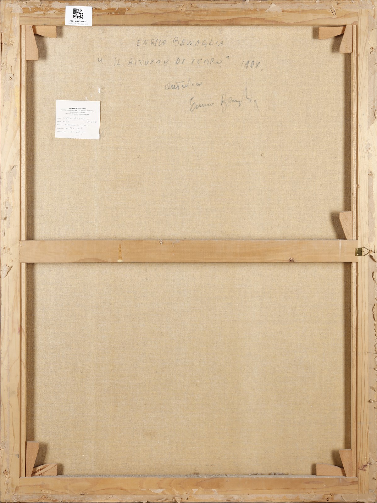 BENAGLIA ENRICO (n. 1938) Il ritorno di Icaro. 1986. Olio su tela . Cm 75,00 x 100,00. Firma e anno in basso a destra. Al retro titolo, firma, anno e cartiglio descrittivo. Autentica dell'artista su fotografia.