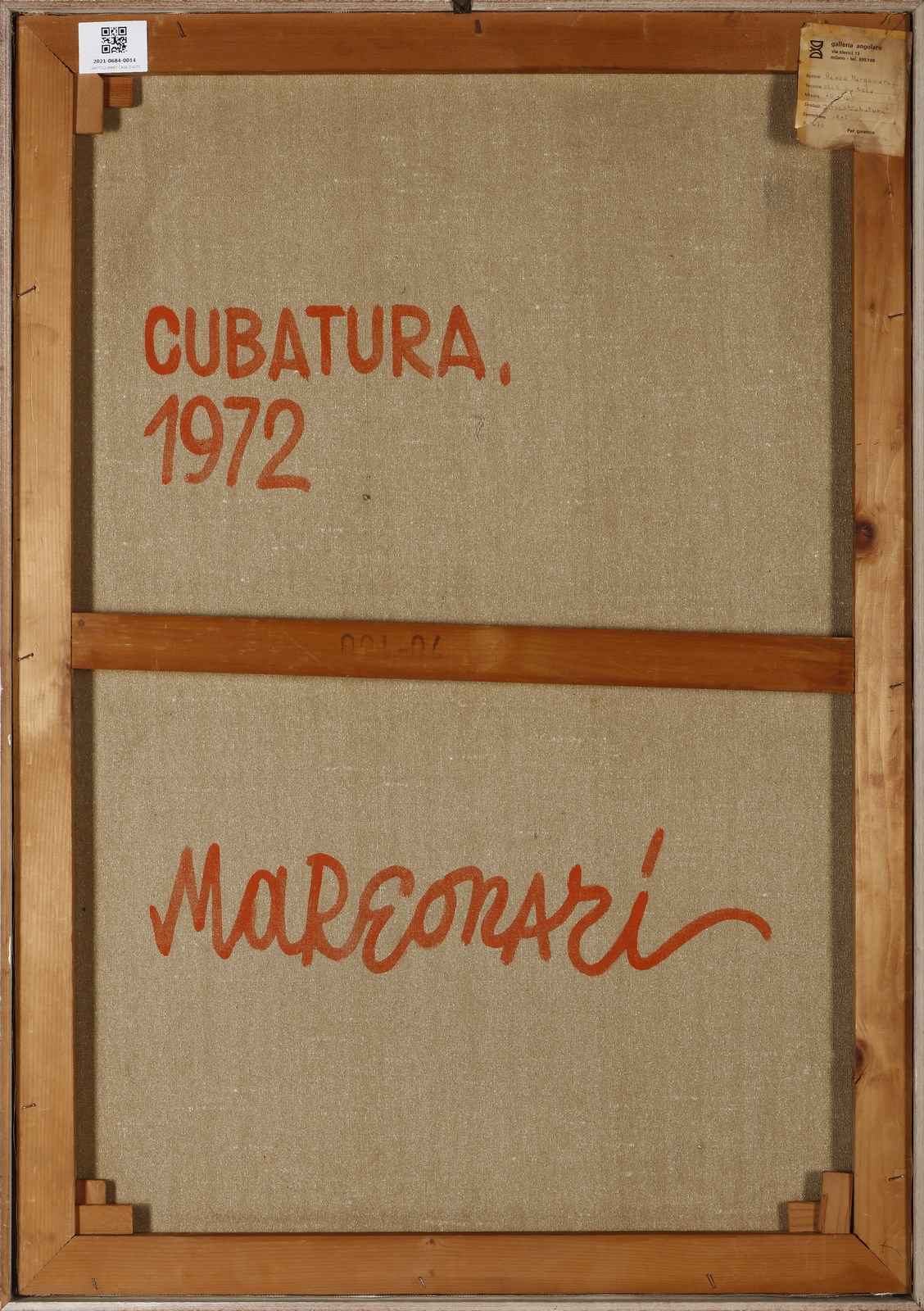 MARGONARI RENZO (n. 1939) Cubatura. 1972. Olio su tela . Cm 70,00 x 100,00. Firma e anno in alto al centro. Al retro titolo, firma, anno e cartiglio descrittivo Galleria Angolare, Milano. Pubblicazione: Renzo Margonari, Galleria Angolare, Milano, 1 -15 Novembre 1972. Esposizione: Renzo Margonari, Galleria Angolare, Milano, 1 -15 Novembre1972. Difetti. Cornice presente