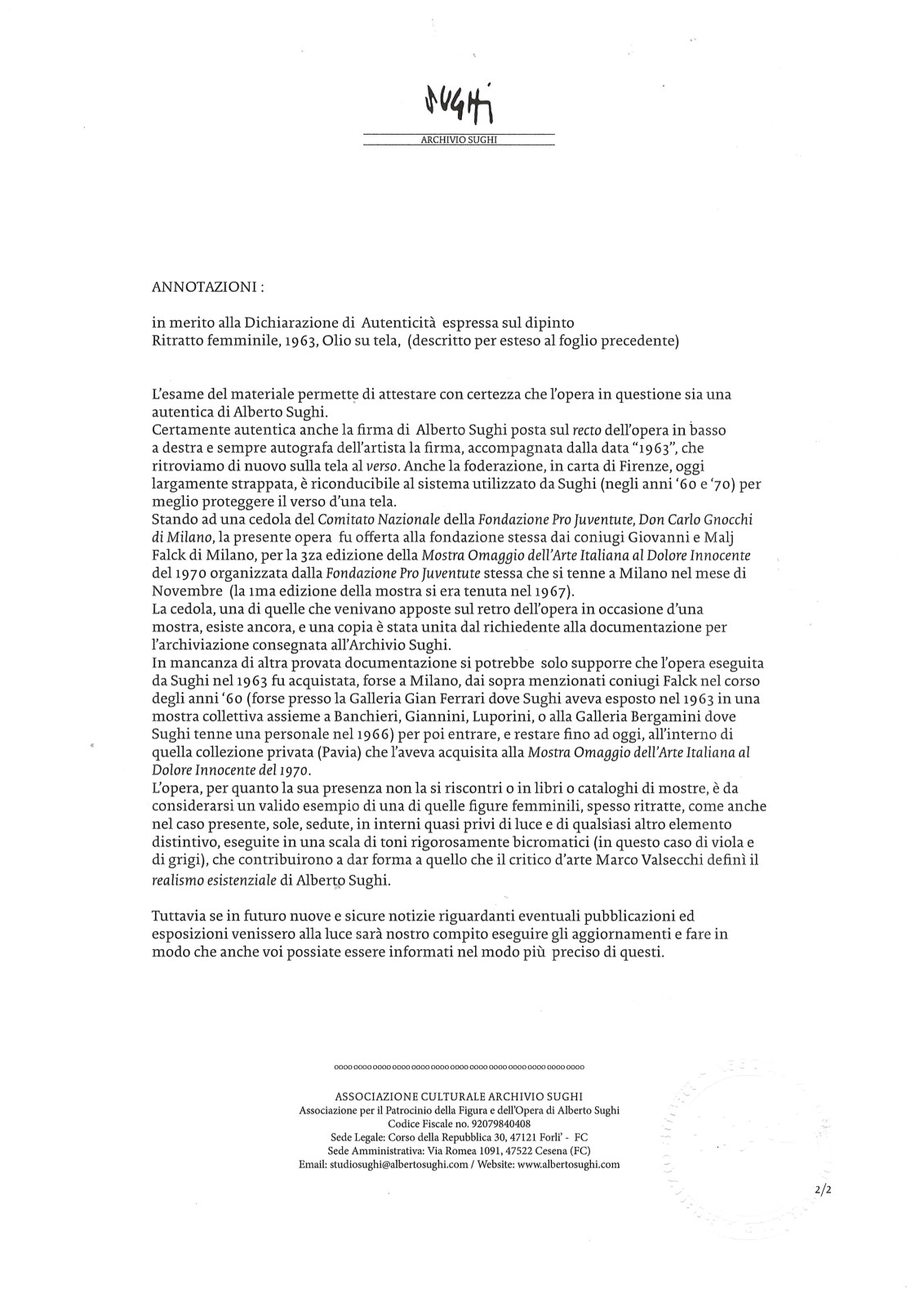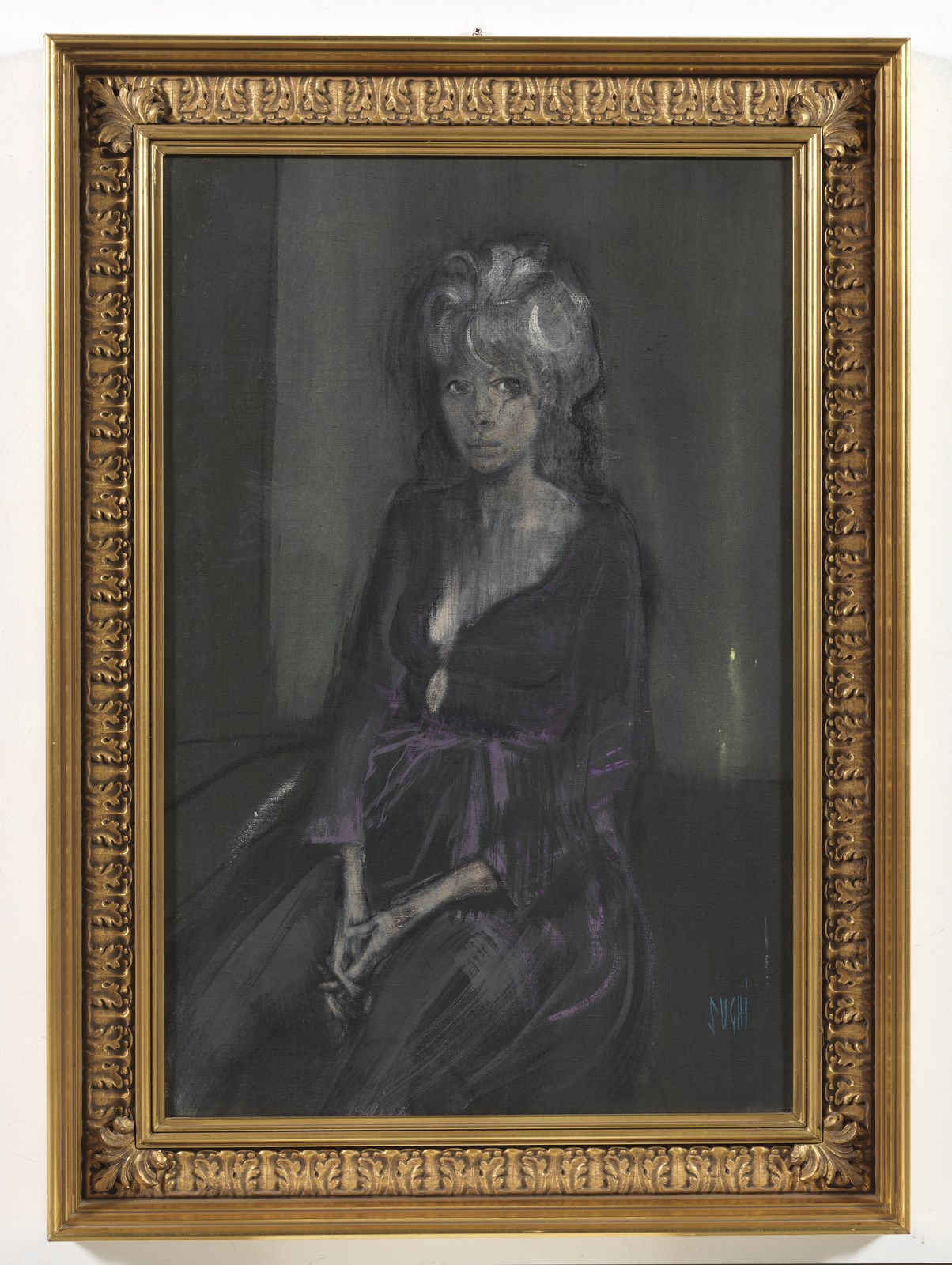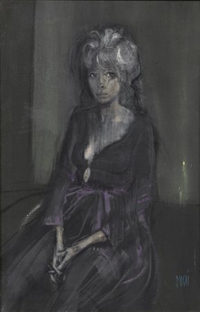 SUGHI ALBERTO (n. 1928) Ritratto femminile. 1963. Olio su tela . Cm 60,00 x 90,00. Firma in basso a destra. Al retro firma e anno. Opera archiviata presso l'Associazione Culturale Alberto Sughi, Forlì, come da documentazione fotografica allegata all'opera riportante il relativo numero d'inventario. Cornice presente