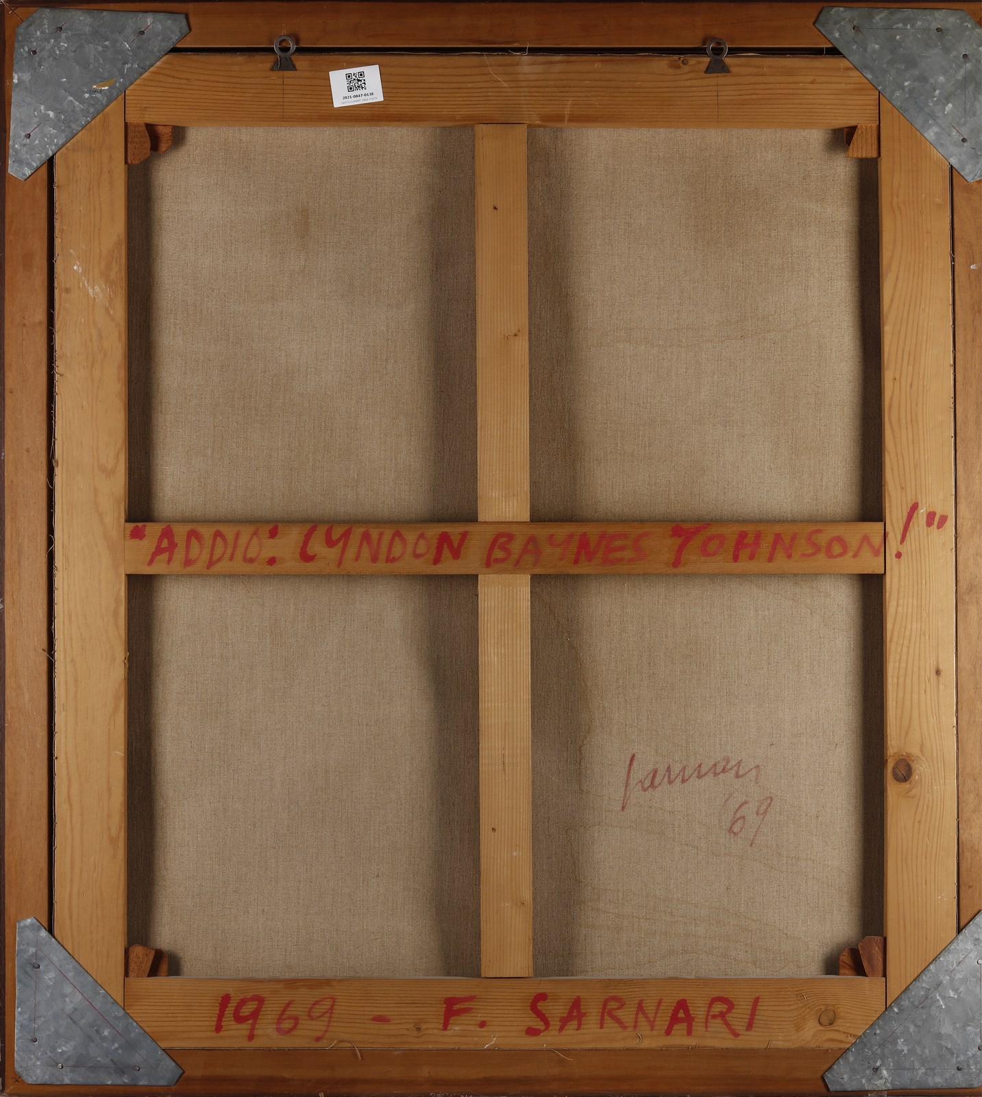 SARNARI FRANCO (n. 1933) Addio: Lyndon Bynes Jhonson!. 1969. Olio su tela . Cm 95,00 x 105,00. Al retro titolo, firma e anno. Sitografia: http://www.sarnari.it/images/opere/matermea/04.htm