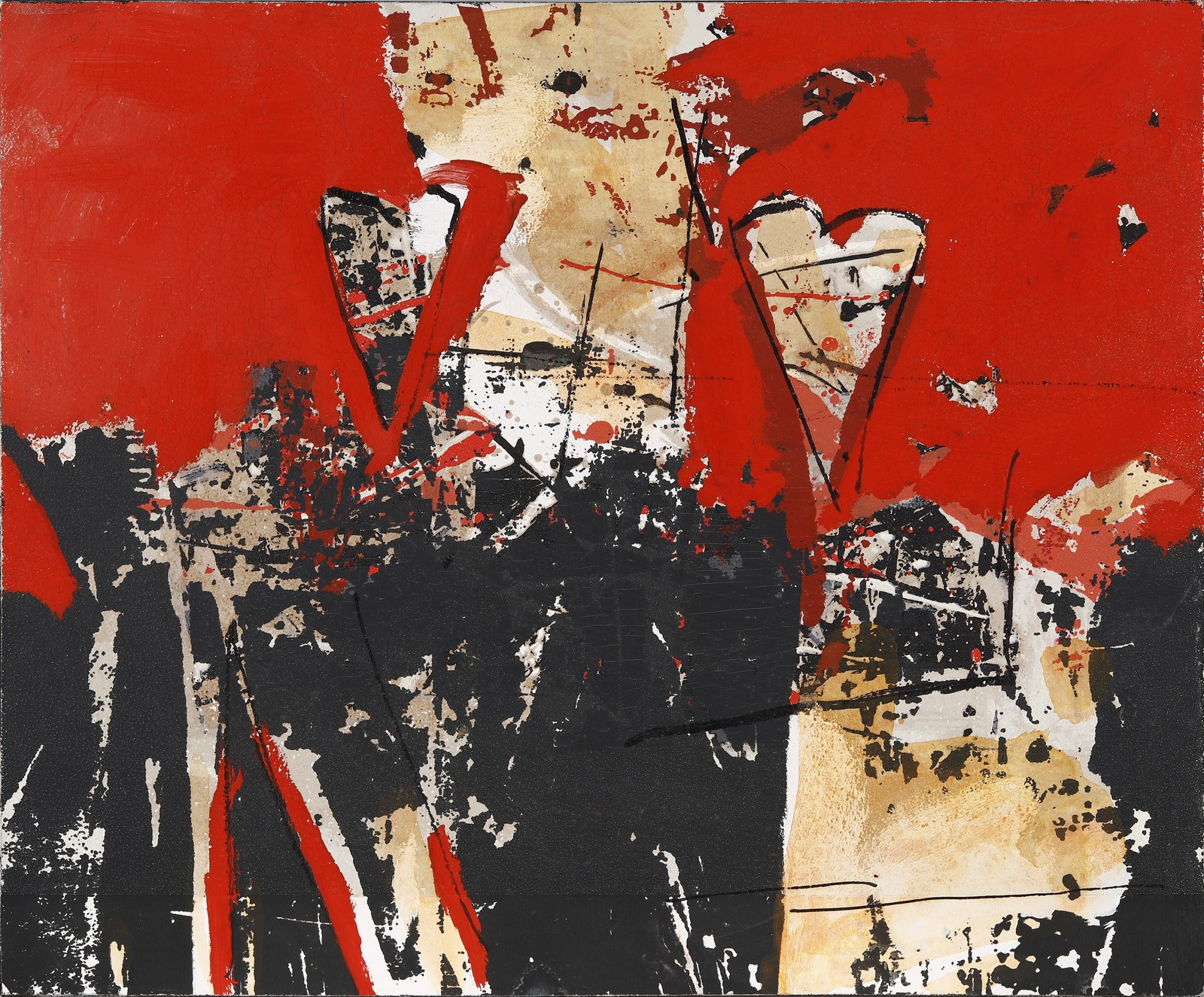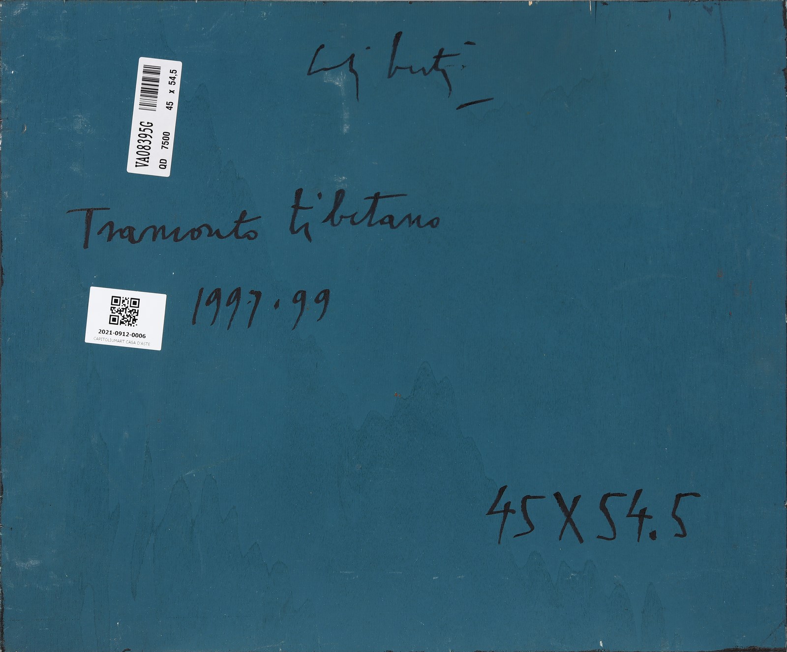 CELIBERTI GIORGIO (n. 1929) Tramonto tibetano. Tecnica mista su tavola. Cm 54,00 x 45,00. 1997-1999. Al retro titolo, firma e anno. Autentica dell'artista su fotografia riportante il relativo numero d'inventario. Certificato di provenienza, Telemarket.