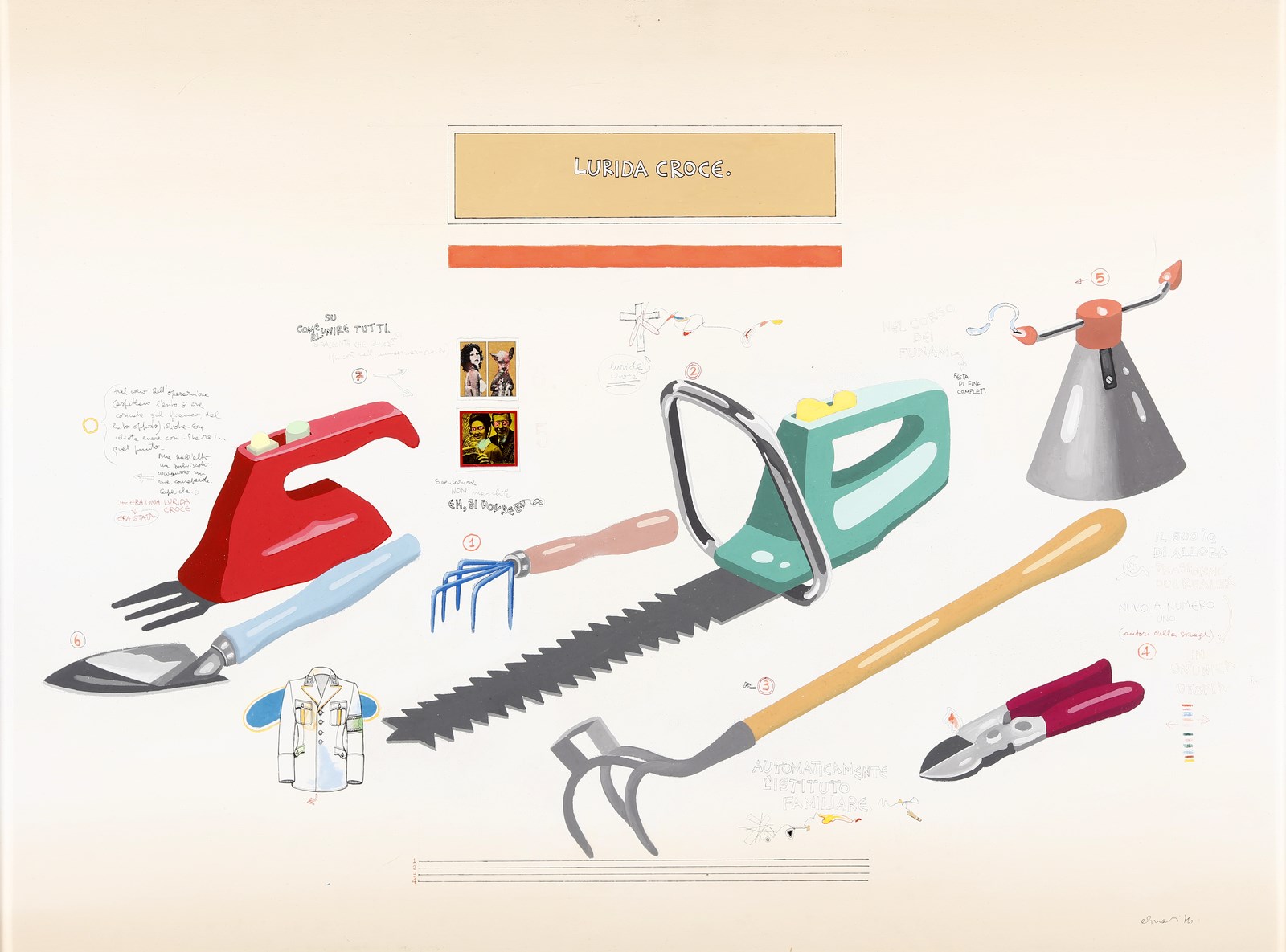 ALINARI LUCA (n. 1943) Lurida croce. 1974. Acrilico su tela. Cm 100,00 x 70,00. Titolo in alto al centro. Firma in basso a destra. Al retro cartiglio descrittivo Galleria d'arte Moderna Sangallo, Firenze. Entro teca di plexiglass. Cornice presente