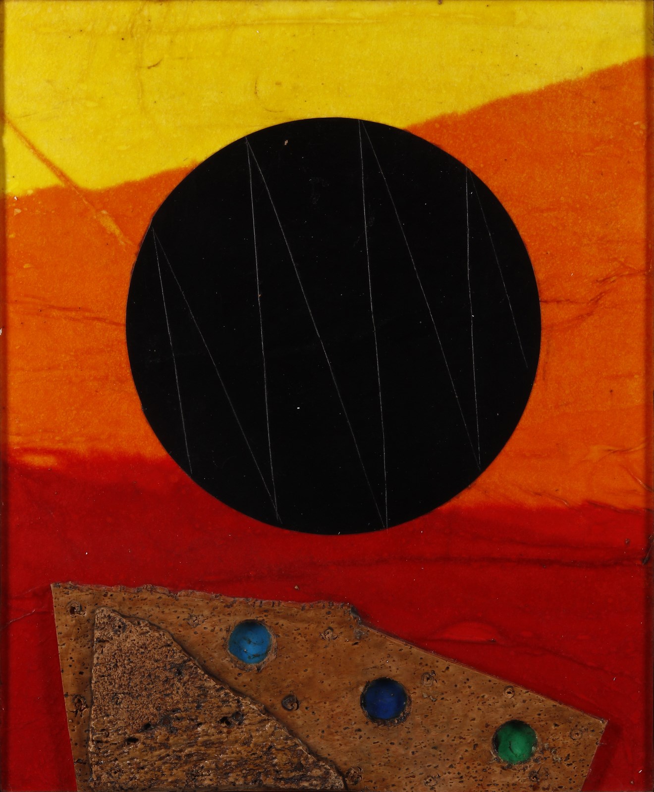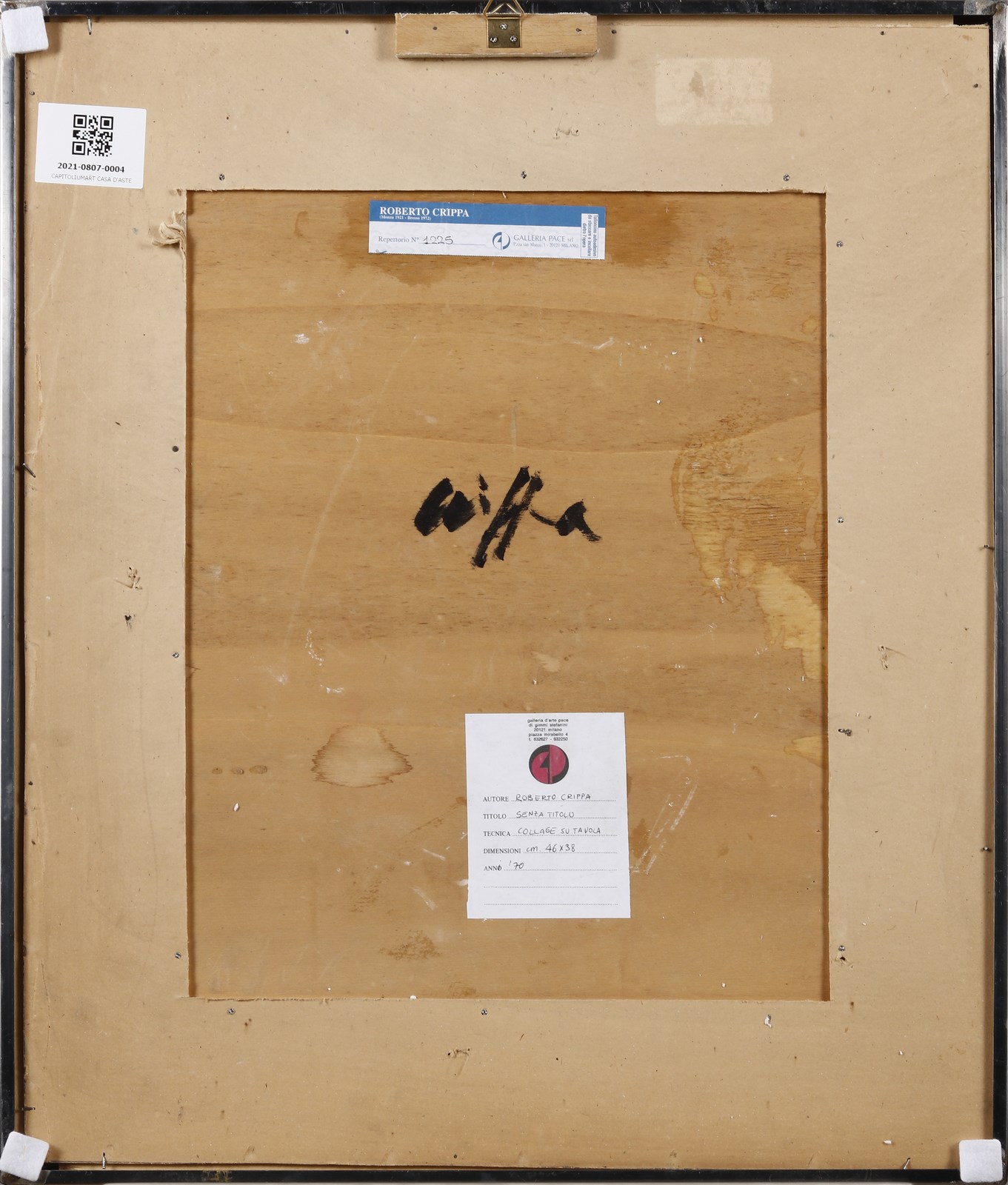CRIPPA ROBERTO GAETANO (1921 - 1972) Senza titolo. Collage su tavola. Cm 38,00 x 46,00. Al retro firma e cartiglio descrittivo della Galleria Pace, Milano. Opera archiviata presso la Galleria Pace, Milano, come da documentazione fotografica allegata all'opera riportante il relativo numero d'inventario. Anni'70. Cornice presente