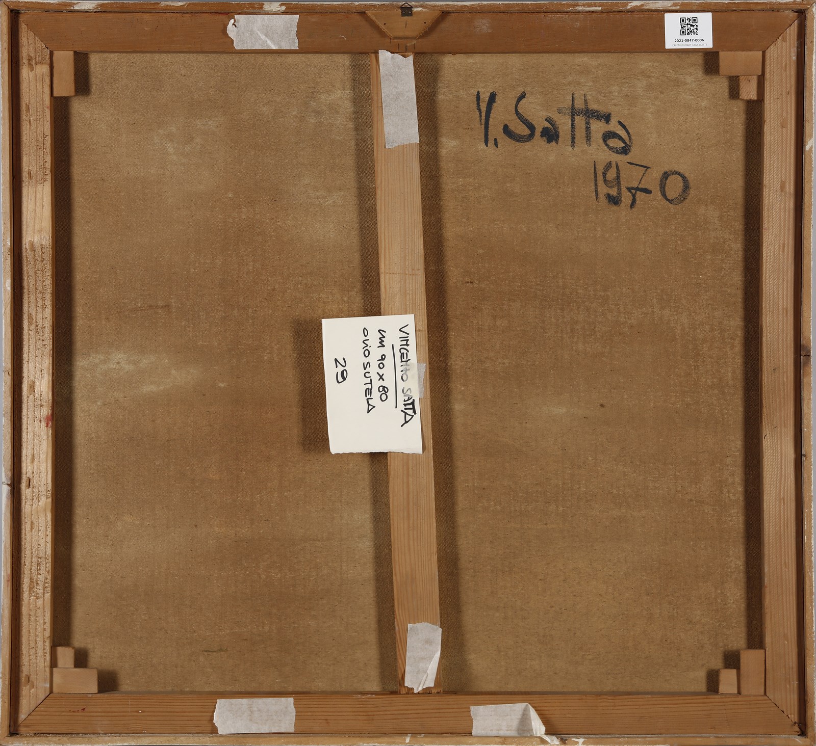 SATTA VINCENZO (n. 1937) Senza titolo. 1970. Acrilico su tela. Cm 90,00 x 80,00. Al retro firma e anno. Difetti. Cornice presente