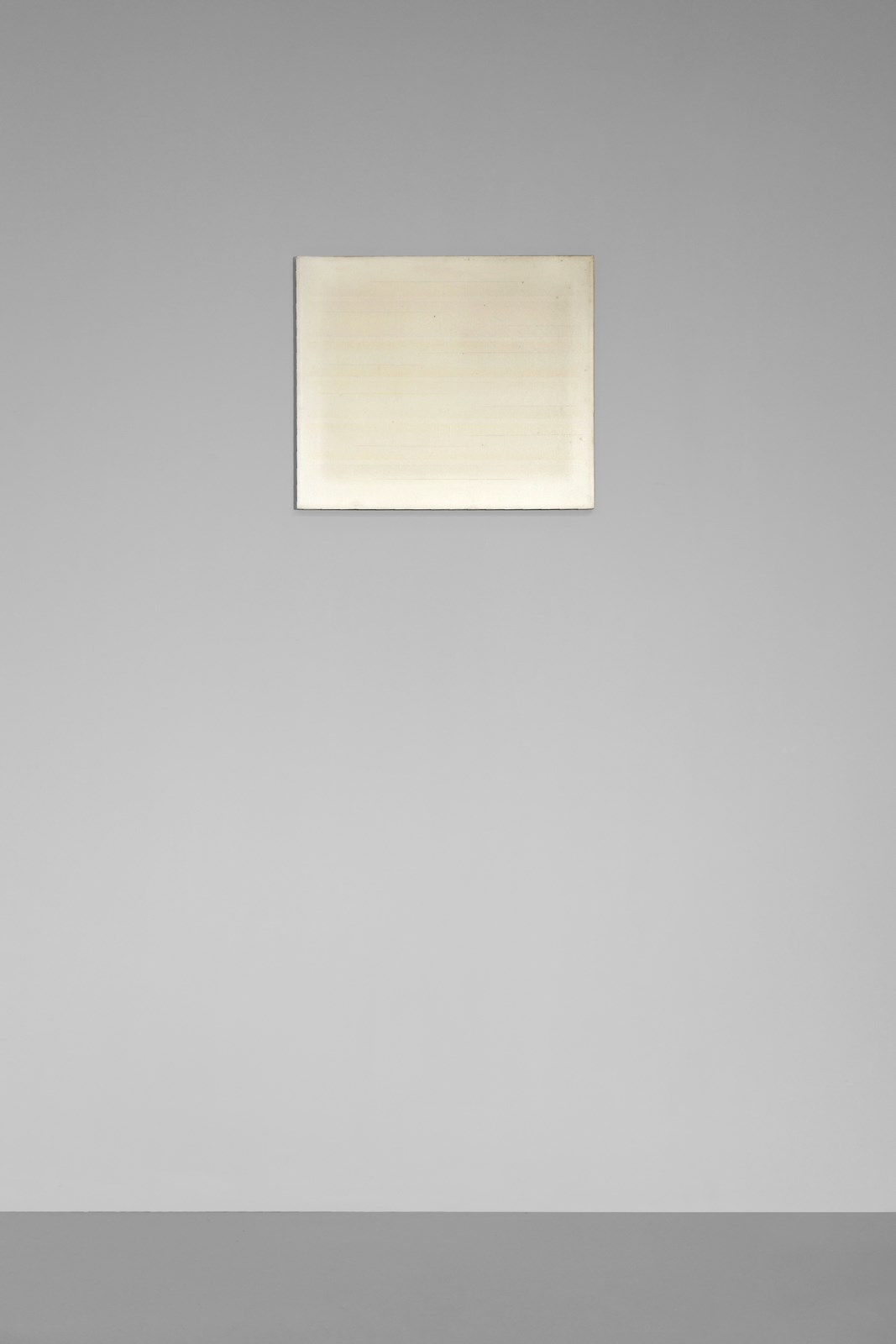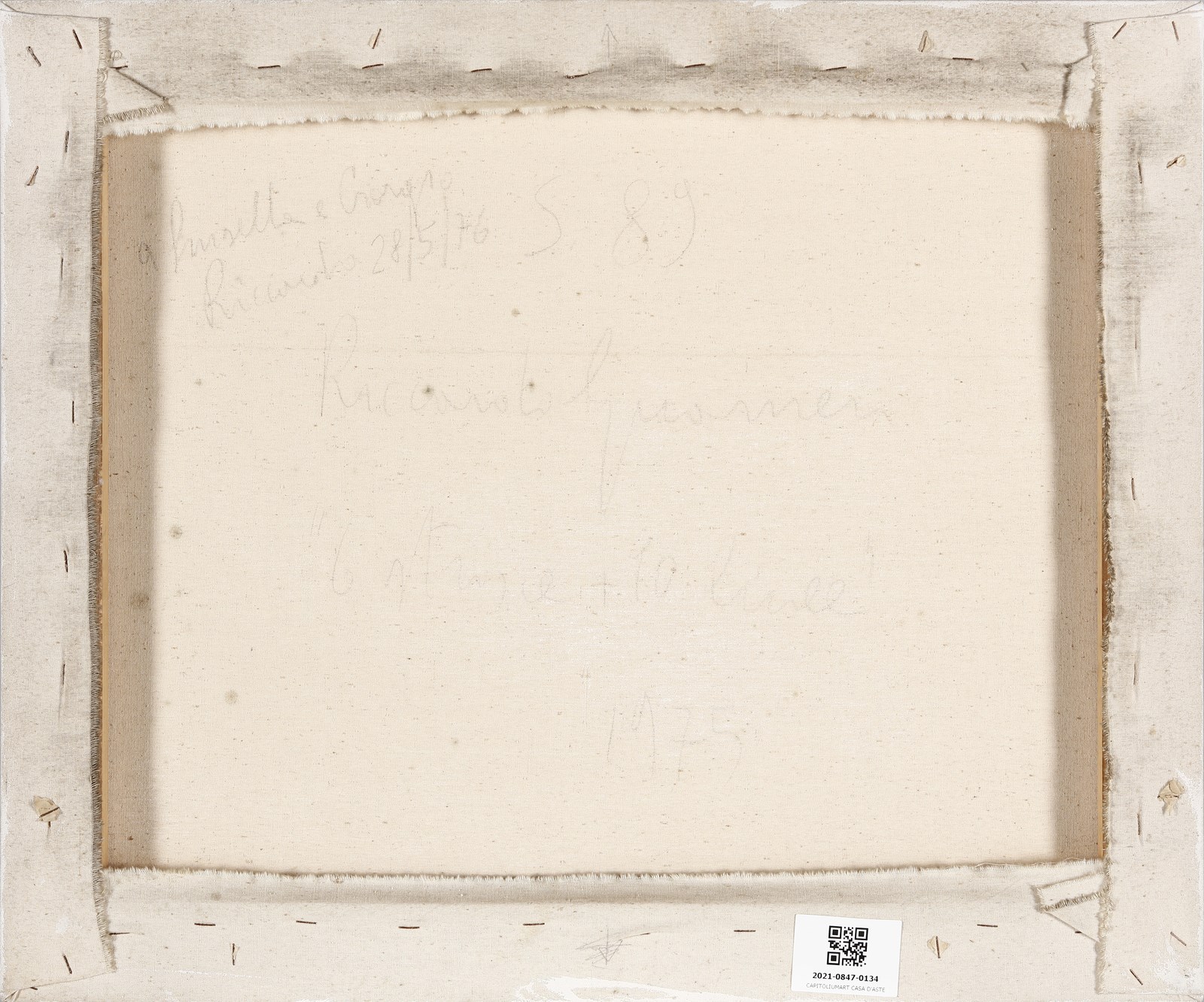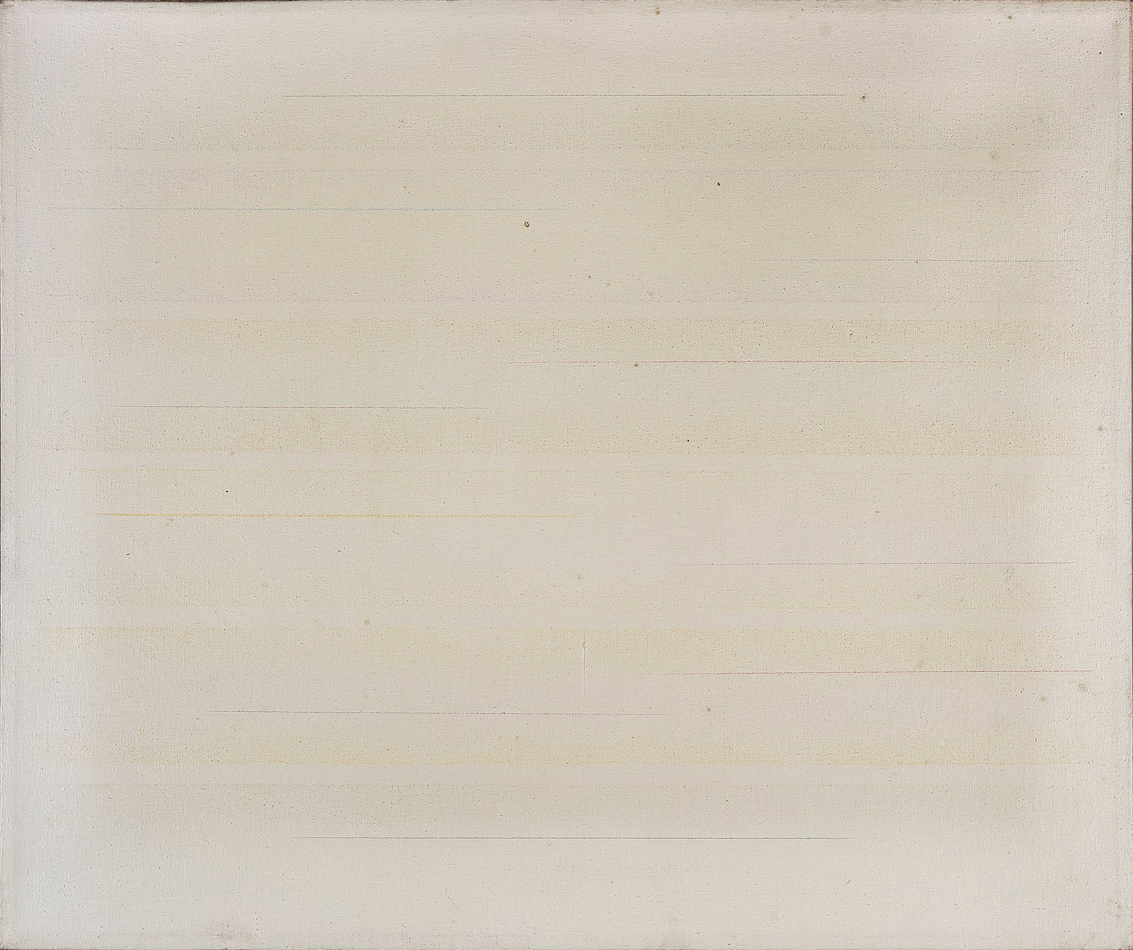 GUARNERI RICCARDO (n. 1933) 6 strisce +10 linee. 1975. Tecnica mista su tela. Cm 60,00 x 50,00. Al retro titolo, firma, dedica e anno.