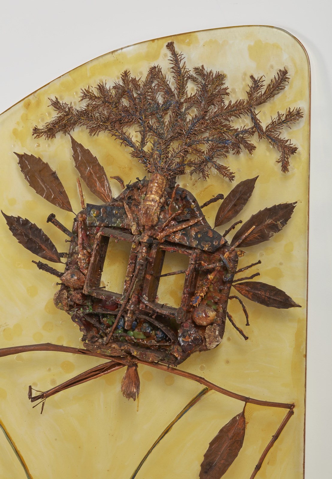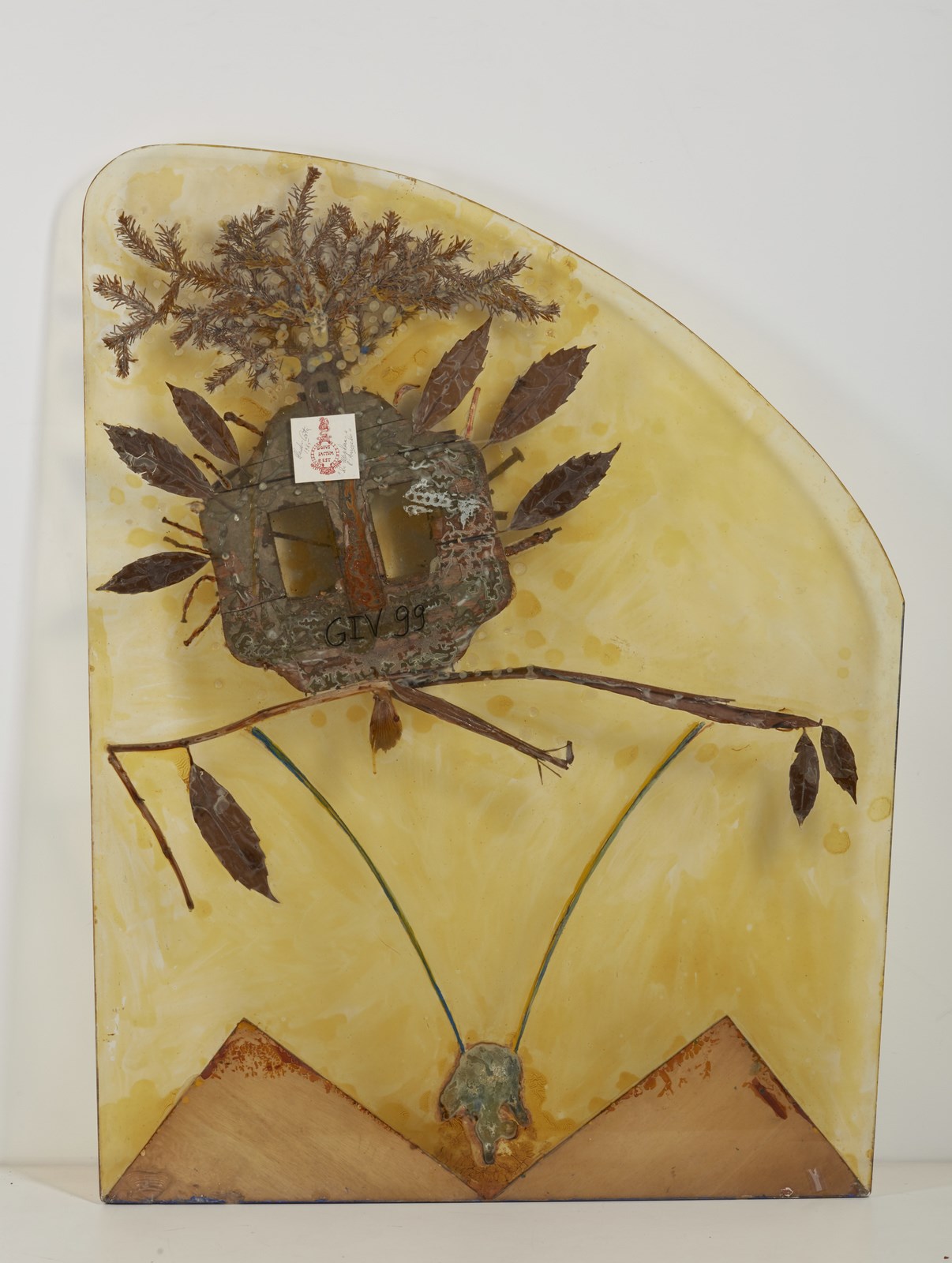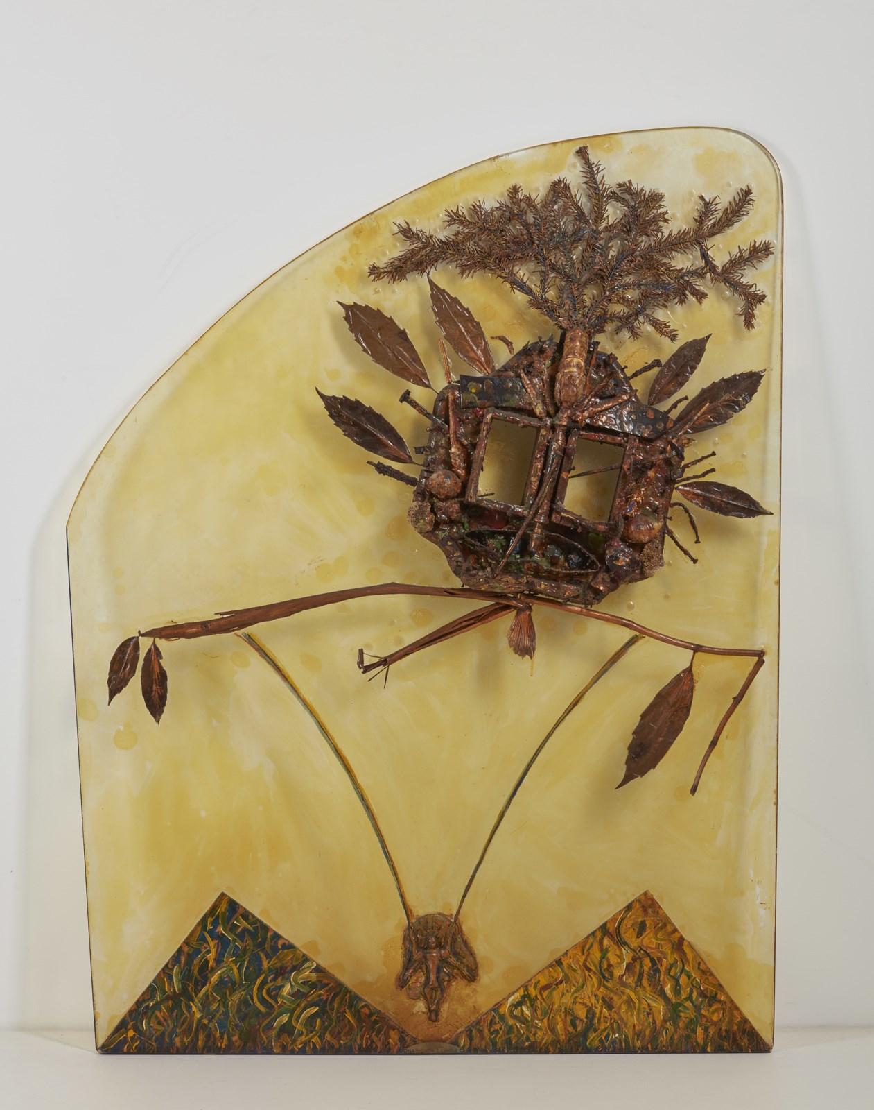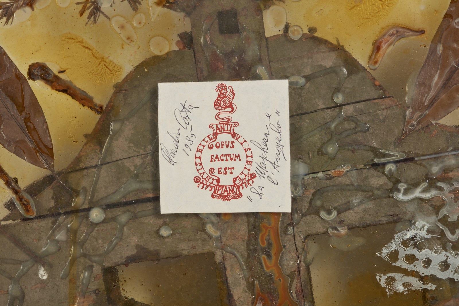 COSTA CLAUDIO (1942 - 1995) La maschera e l'Angelo. 1985. Tecnica mista su vetro. Cm 100,00 x 132,00. Al retro titolo, firma e anno. Opera Archiviate presso l'Archivio Costa.