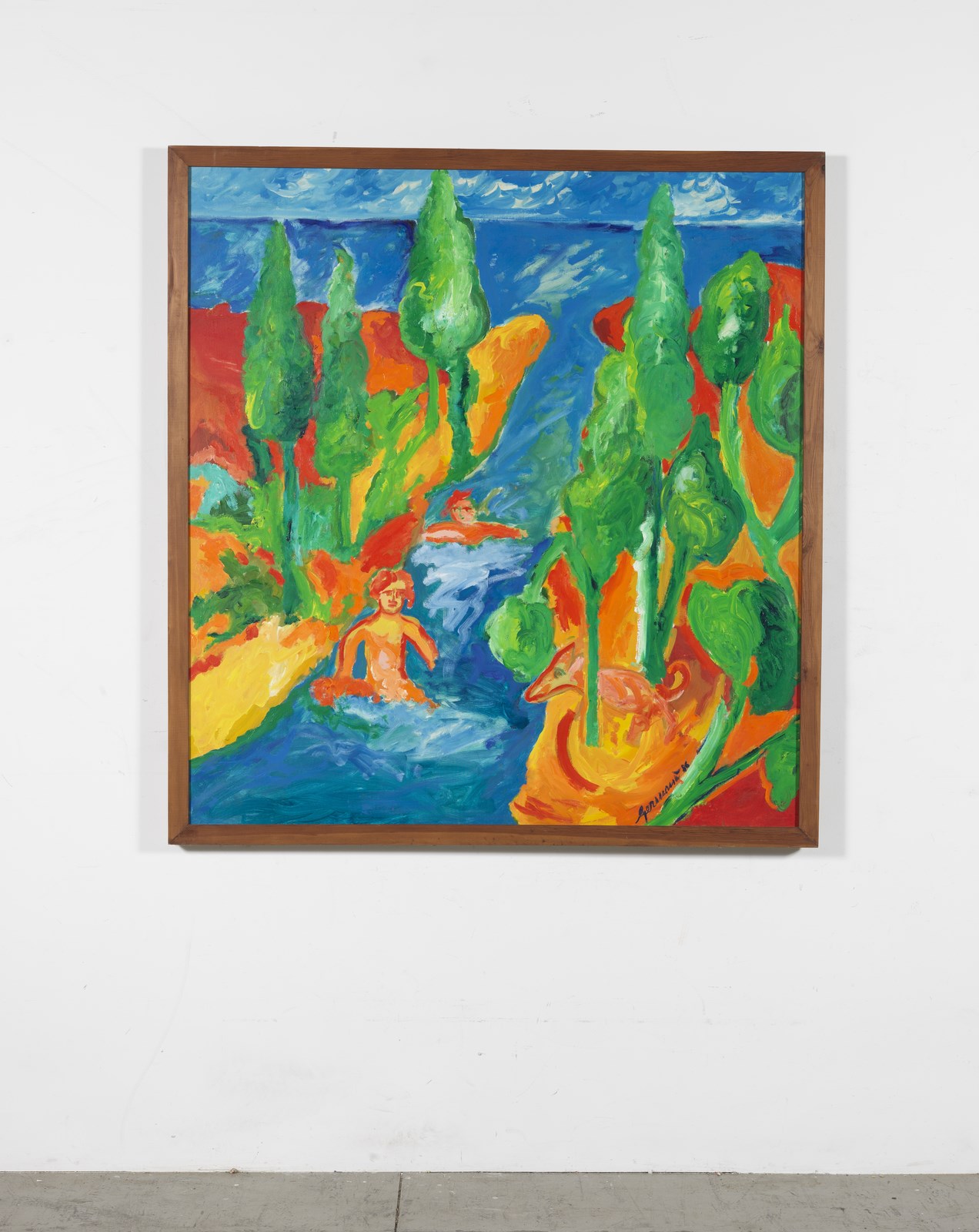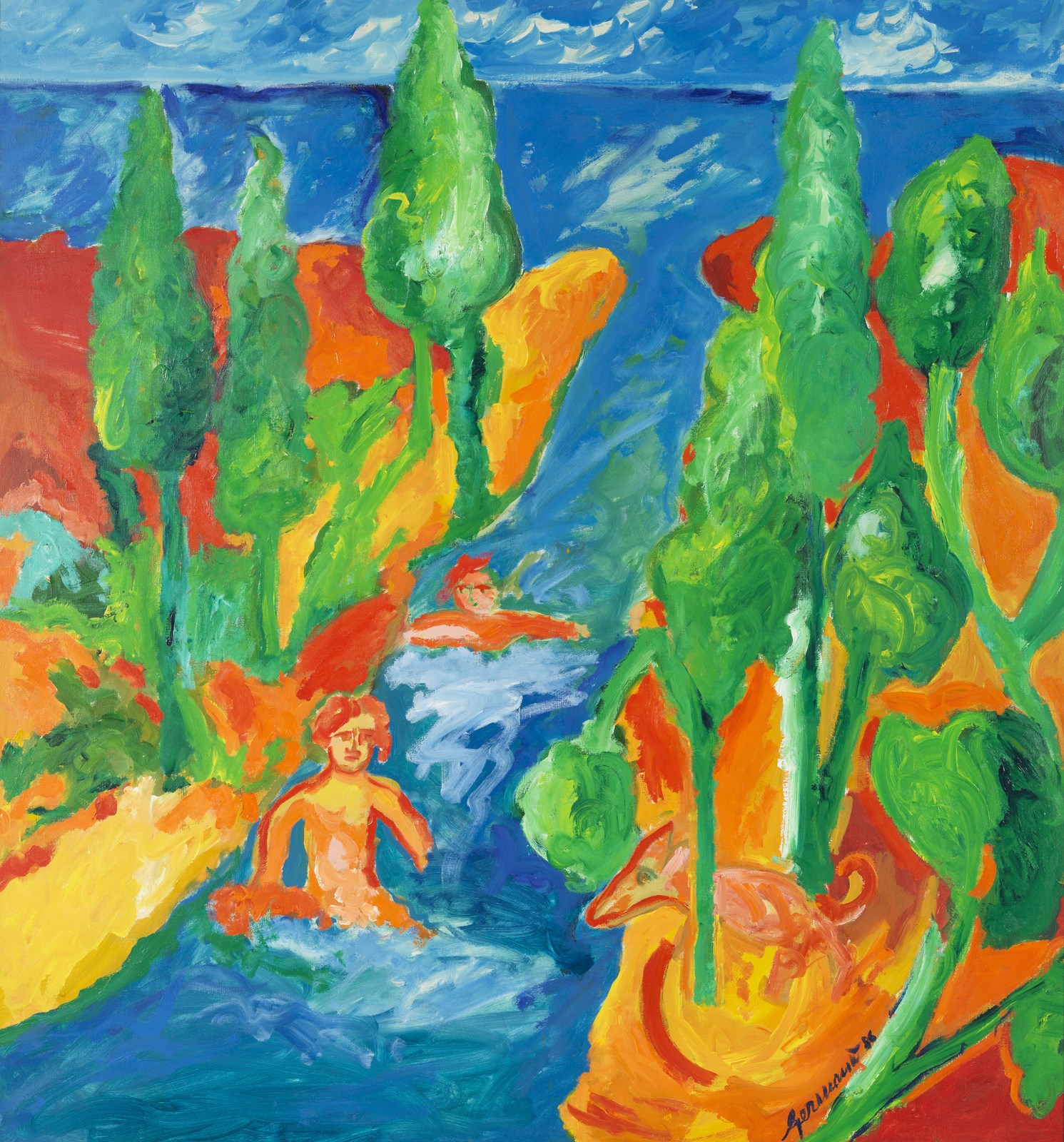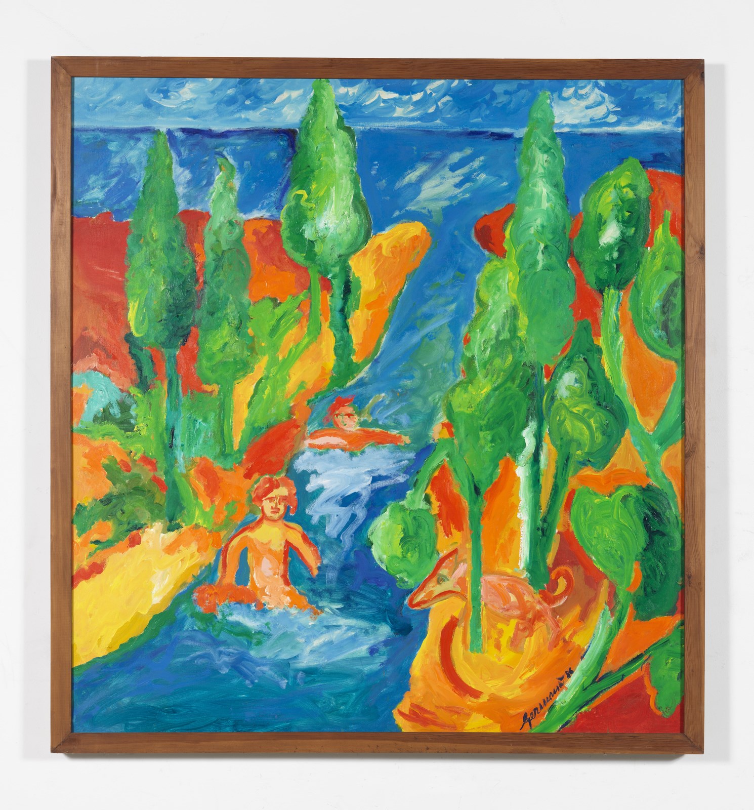 GERMANA' MIMMO (1944 - 1992) La via del mare. 1986. Olio su tela . Cm 140,00 x 150,00. Firma e anno in basso a destra. Al retro titolo e firma. Cornice presente