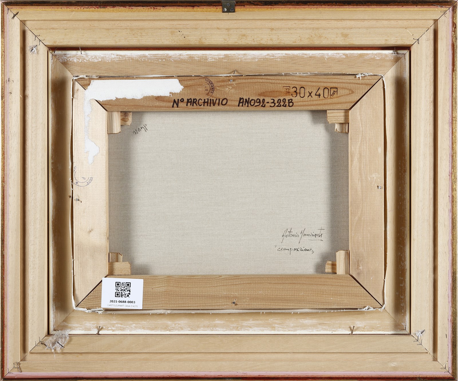 NUNZIANTE ANTONIO (n. 1956) Composizione. 1992. Olio su tela . Cm 40,00 x 30,00. Firma in basso a destra. Al retro titolo e firma. Opera archiviata preso l'Archivio Antonio Nunziante, Torino, come da documentazione fotografica allegata all'opera riportante il relativo numero d'inventario e la firma dell'artista.