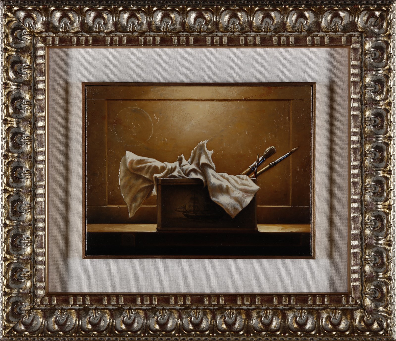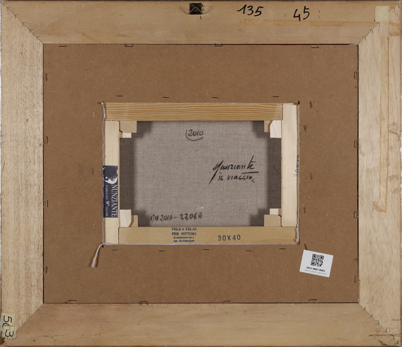 NUNZIANTE ANTONIO (n. 1956) Il viaggio. 2010. Olio su tela . Cm 40,00 x 30,00. Firma in basso a destra. Al retro titolo e firma. Opera archiviata presso l'Archivio Antonio Nunziante, Torino, come da documentazione fotografica allegata all'opera riprotante il relativo numero d'inventario e la firma dell'artista. Provenienza: Studio d'arte Nunziante; Galleria d'arte F.lli Orler; Collezione privata, Torino. Cornice presente