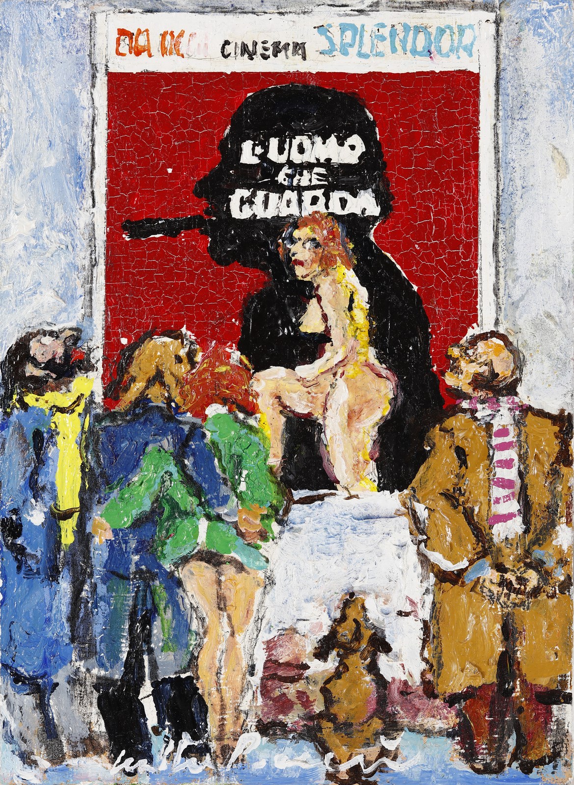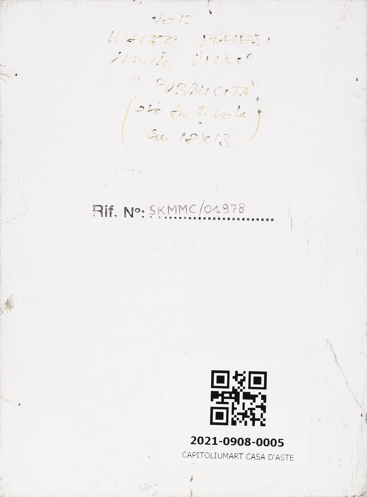 PIACESI WALTER (n. 1929) Pubblicità. 2012. Olio su tavola. Cm 13,00 x 18,00. Firma in basso al centro. Al retro titolo e firma. Opera archiviata presso lo Studio d'arte Edizioni Ca' Spinello, Fermignano, come da documentazione fotografica allegata all'opera riportante il relativo numero d'inventario e la firma dell'artista.