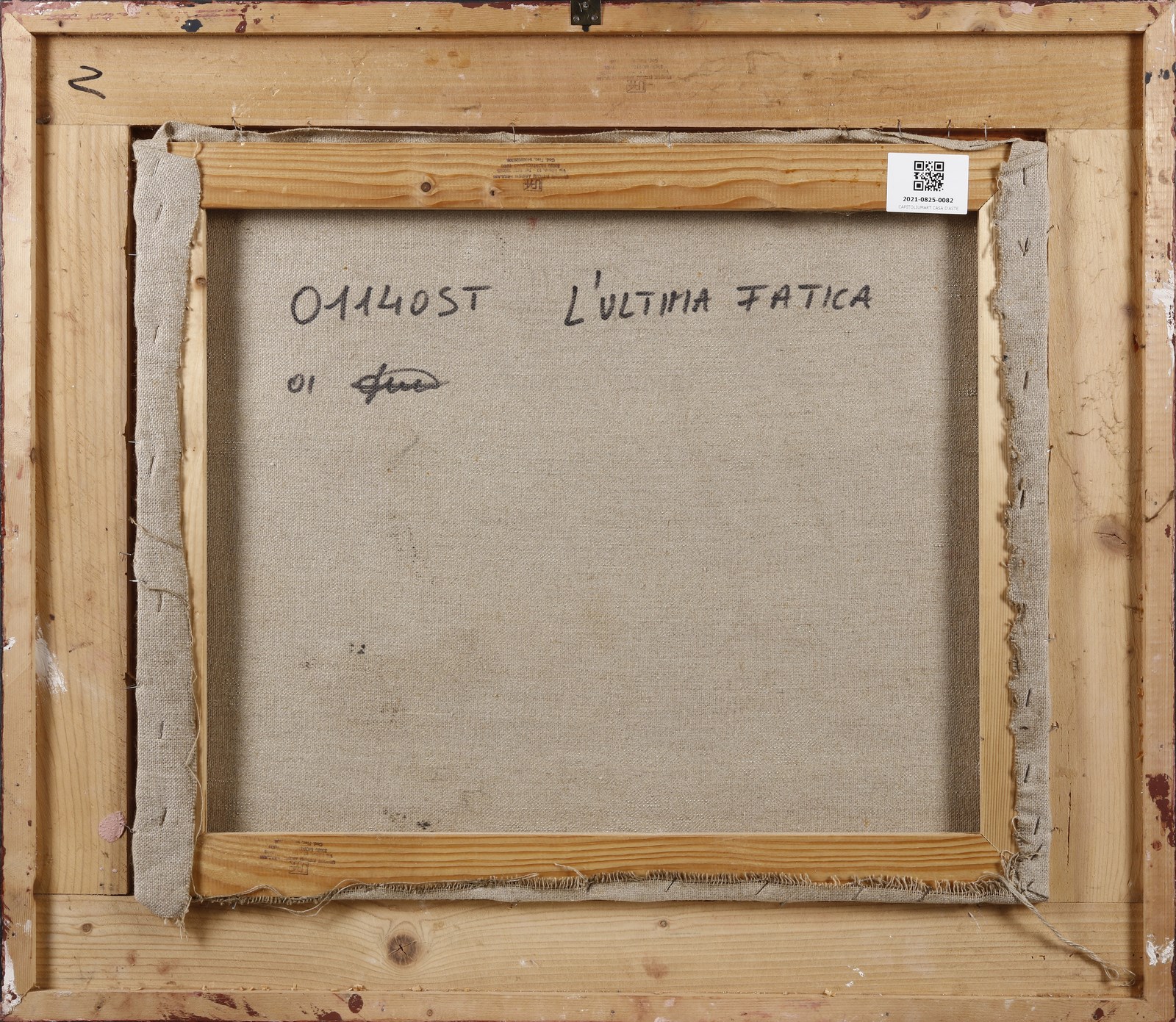 DE LUTTI PIERLUIGI (n. 1959) L'ultima fatica. 2001. Olio su tela . Cm 60,00 x 50,00. Firma e anno in basso a destra. Al retro titolo e firma. Cornice presente