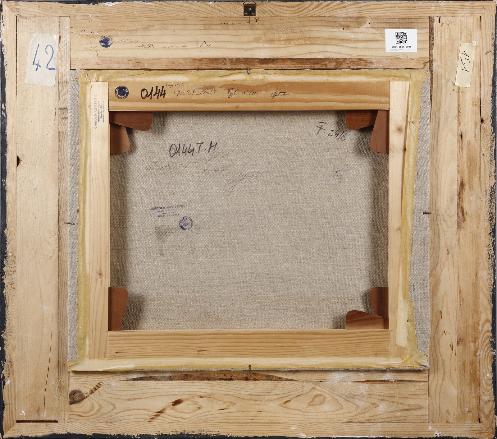 DE LUTTI PIERLUIGI (n. 1959) Senza titolo. Tecnica mista su tela. Cm 60,00 x 50,00. Firma in basso a destra. Cornice presente