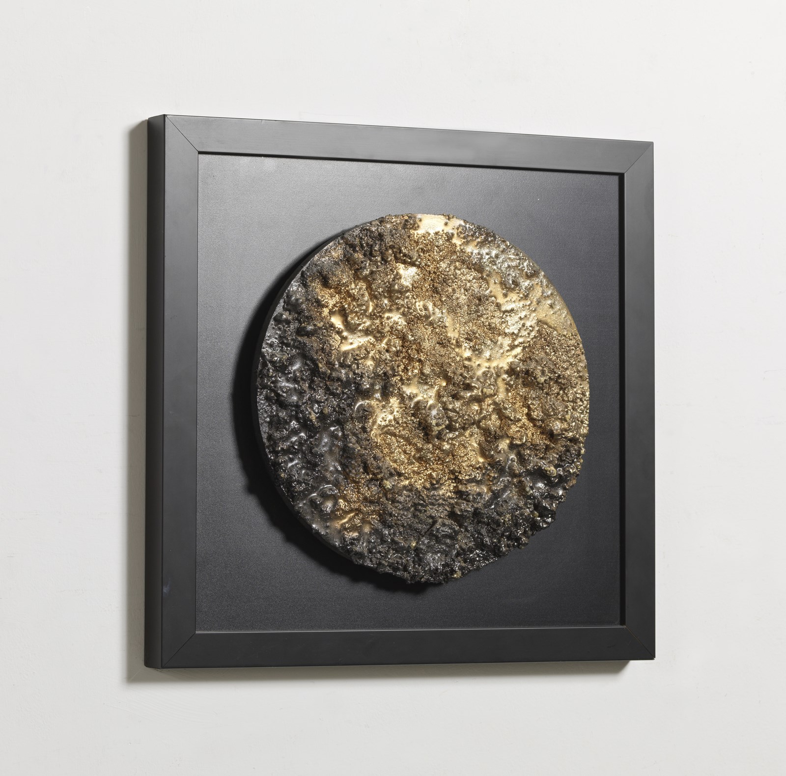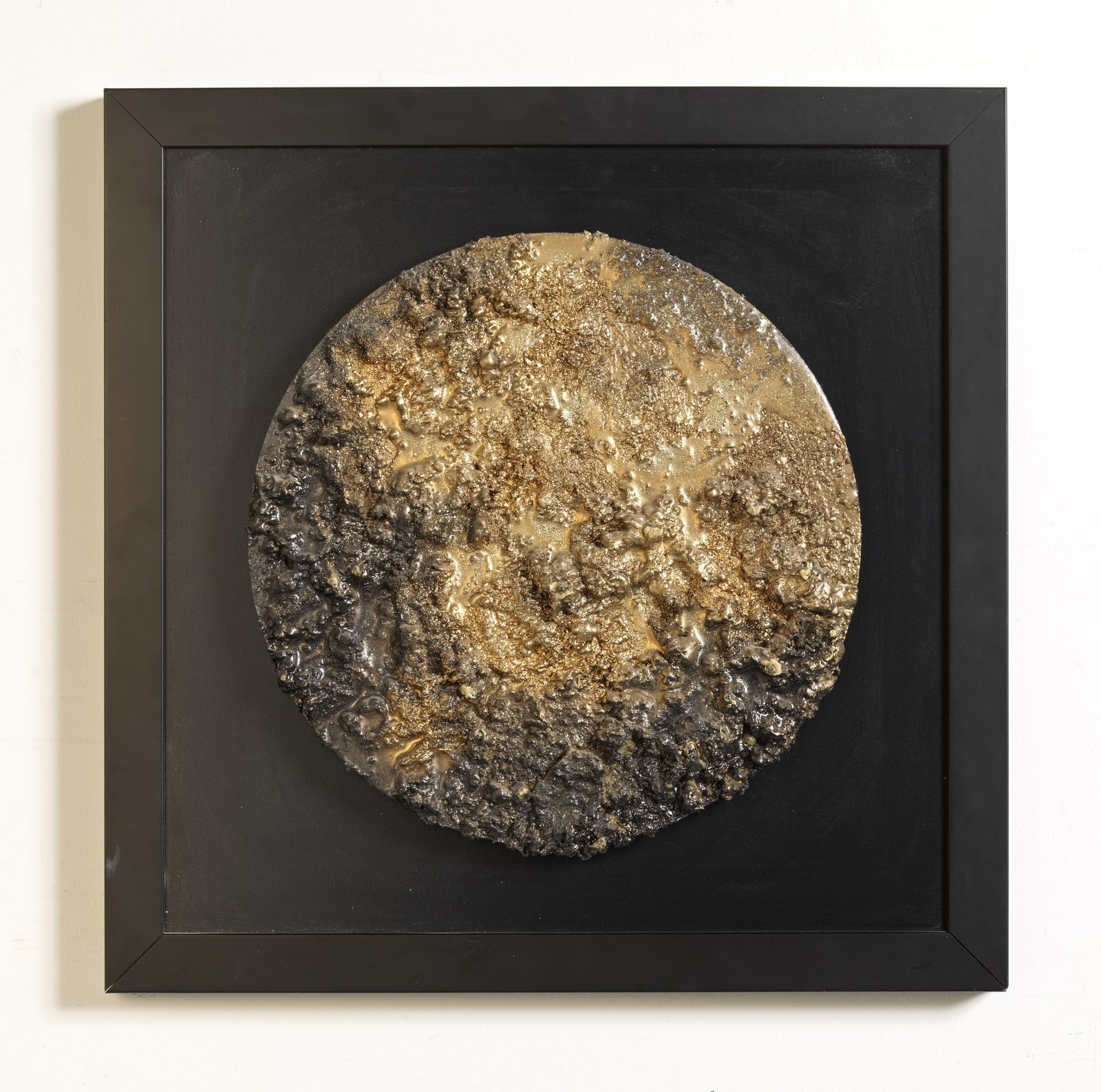 ROMANO PAOLA (n. 1951) Luna oro. 2011. Polimaterico su tavola. Cm 30,00 x 30,00. Autentica dell'artista su fotografia. Cornice presente