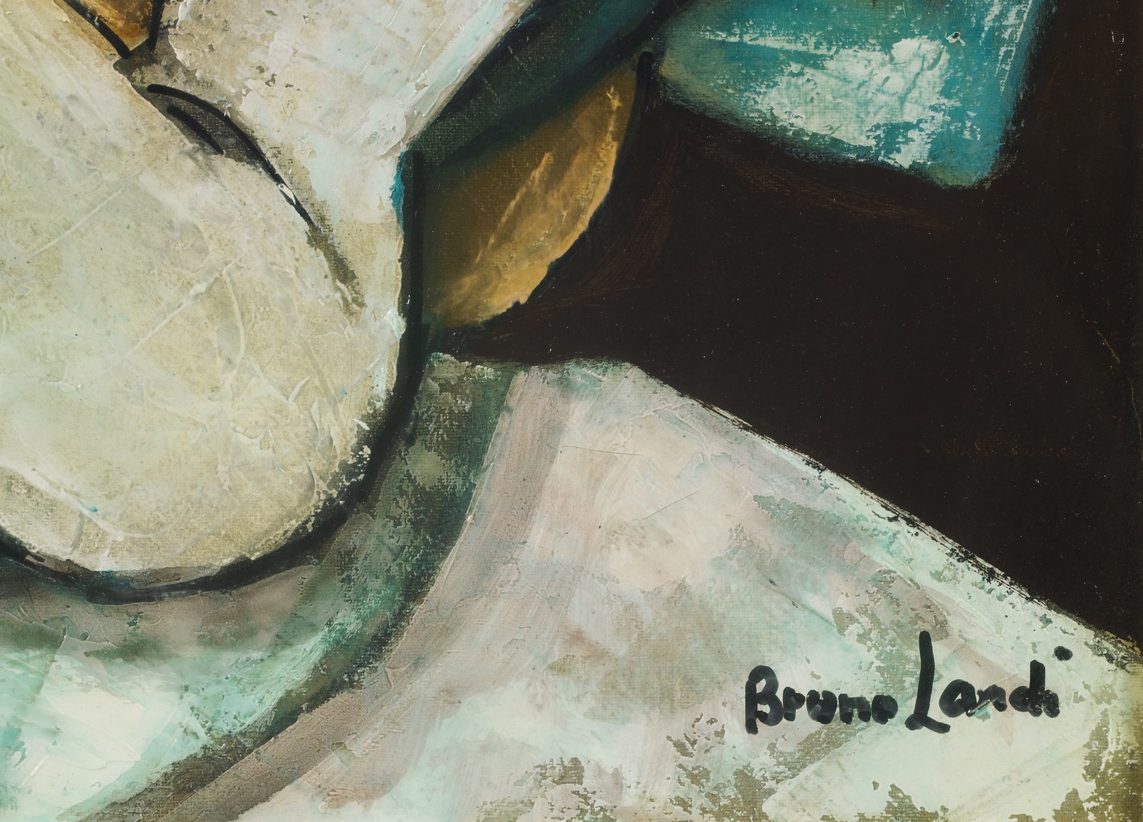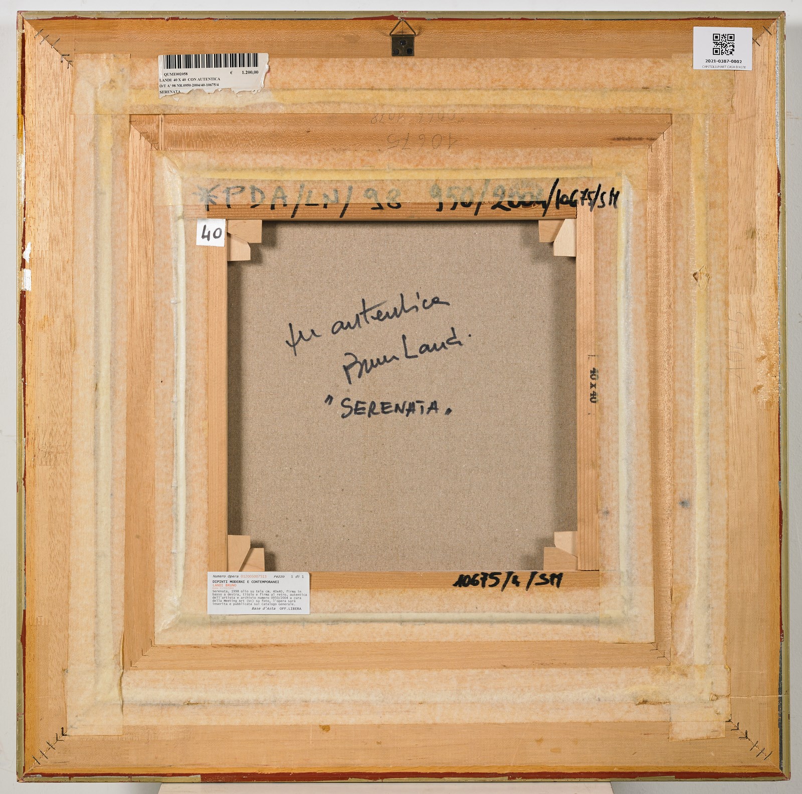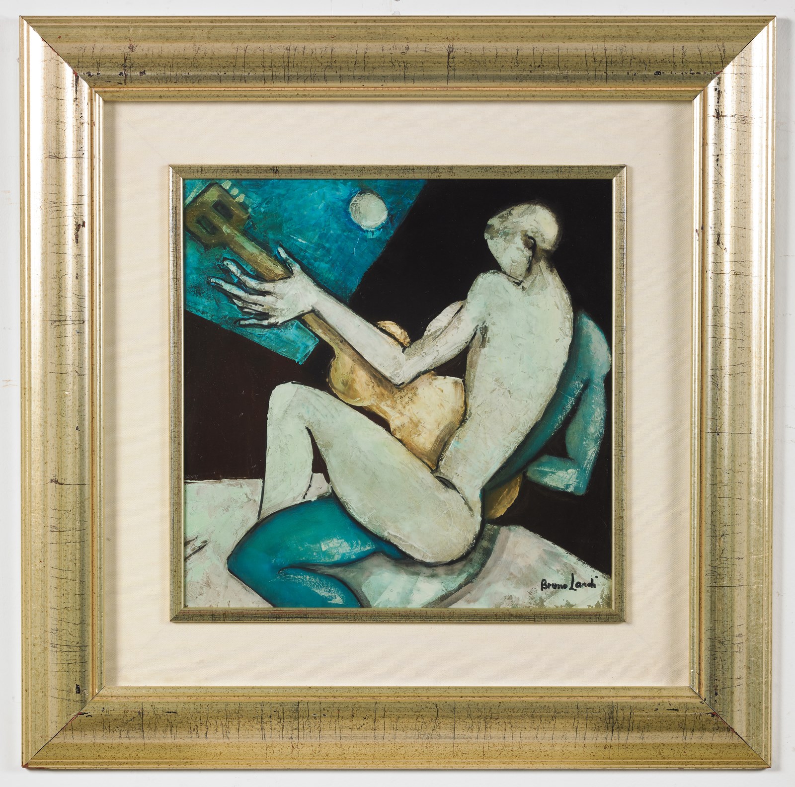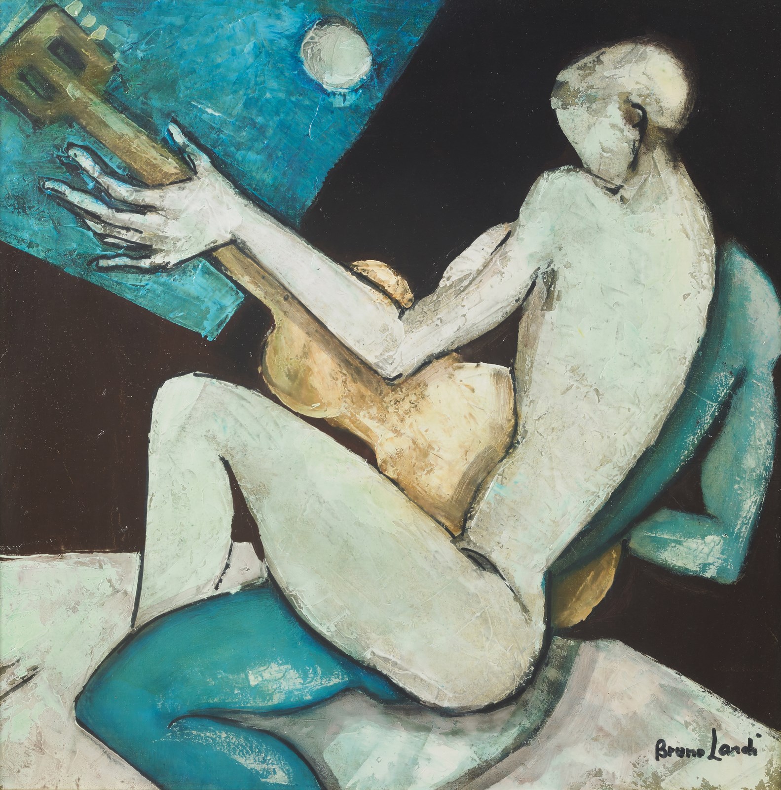 LANDI BRUNO (n. 1941) Serenata. 1998. Olio su tela . Cm 40,00 x 40,00. Firma in basso a destra. Al retro titolo e firma per autentica. Opera archiviata presso la Casa d'aste Meeting Art, Vercelli, come da documentazione fotografica allegata all'opera riportante il relativo numero d'inventario e la firma dell'artista. Pubblicazione: Catalogo generale delle opere di Bruno Landi, Volume I, Giorgio Mondadori Editore, pag.130. Cornice presente