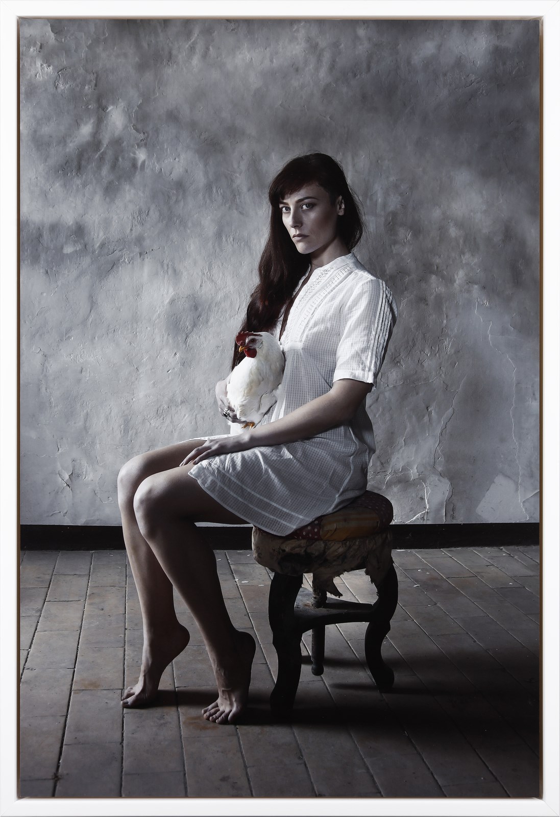 SAVIOLI ROBERTO (n. 1962) Ragazza con gallina. 2017. Fotografia. Cm 67,00 x 100,00. 3/3. Al retro cartiglio descrittivo con firma e timbro dell'artista. Autentica dell'artista su fotografia riportante il relativo numero d'inventario. Cornice presente