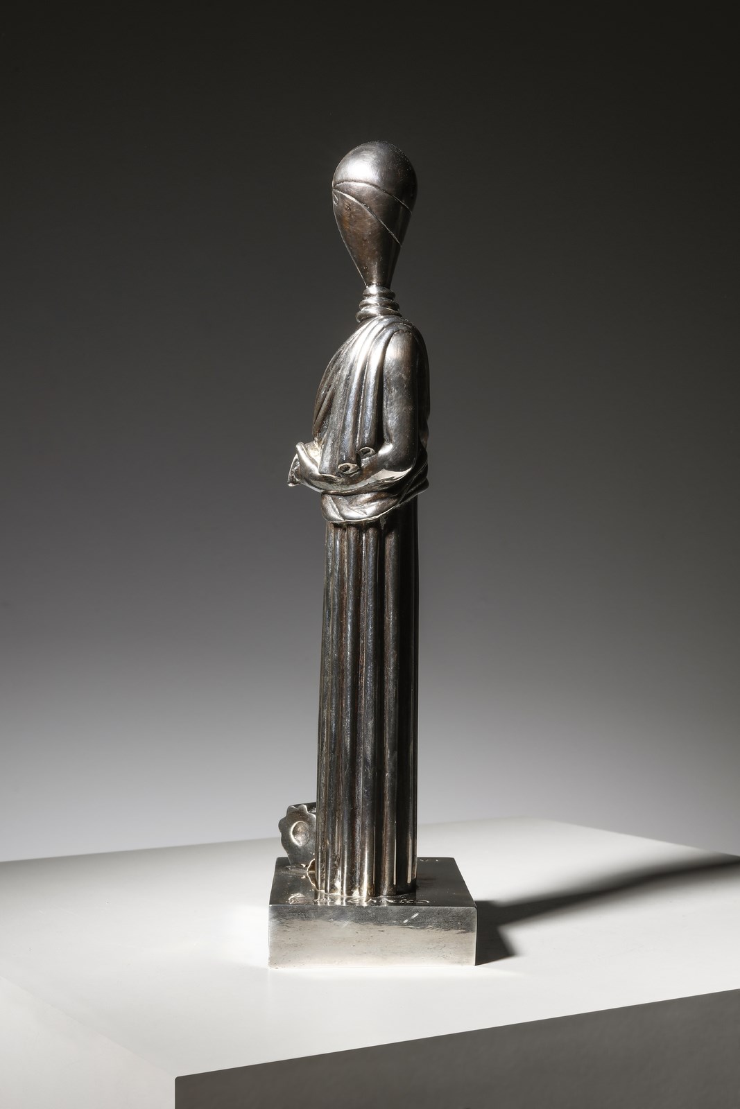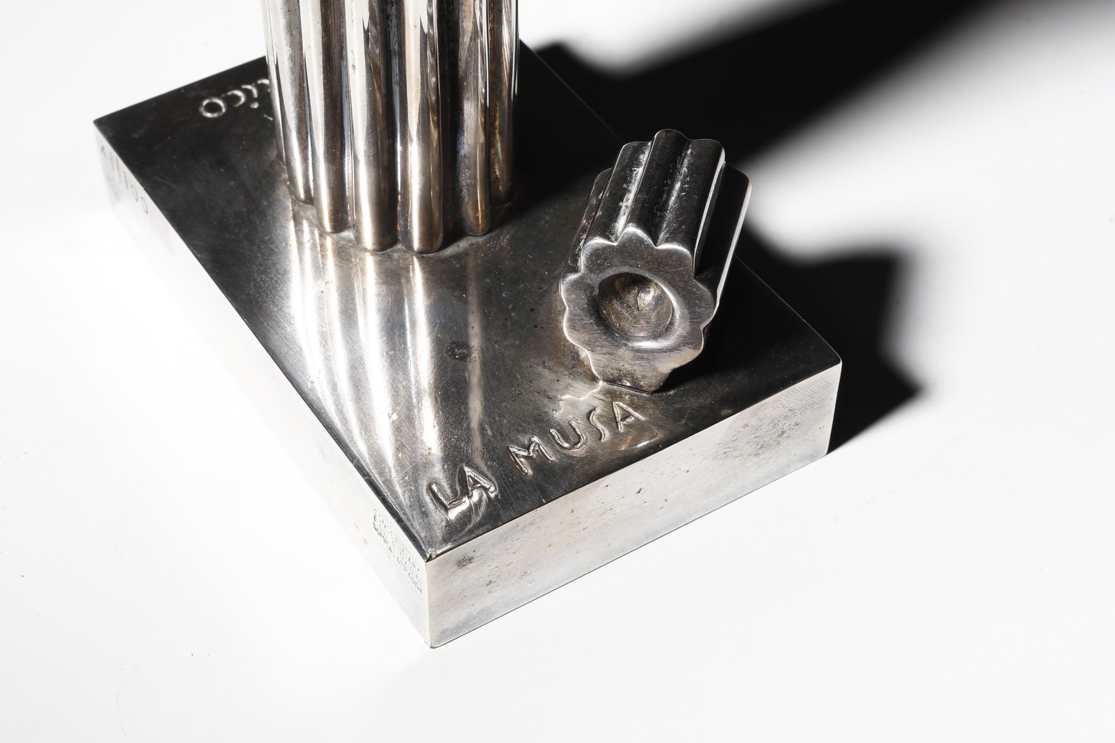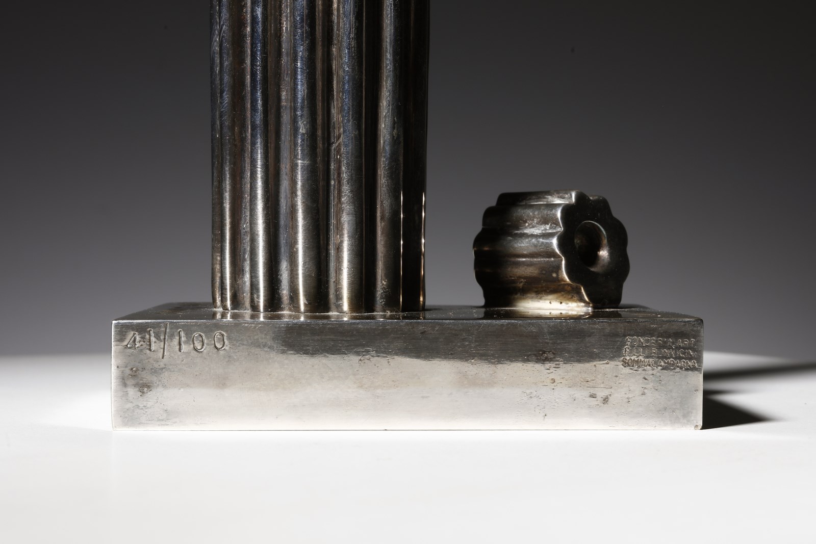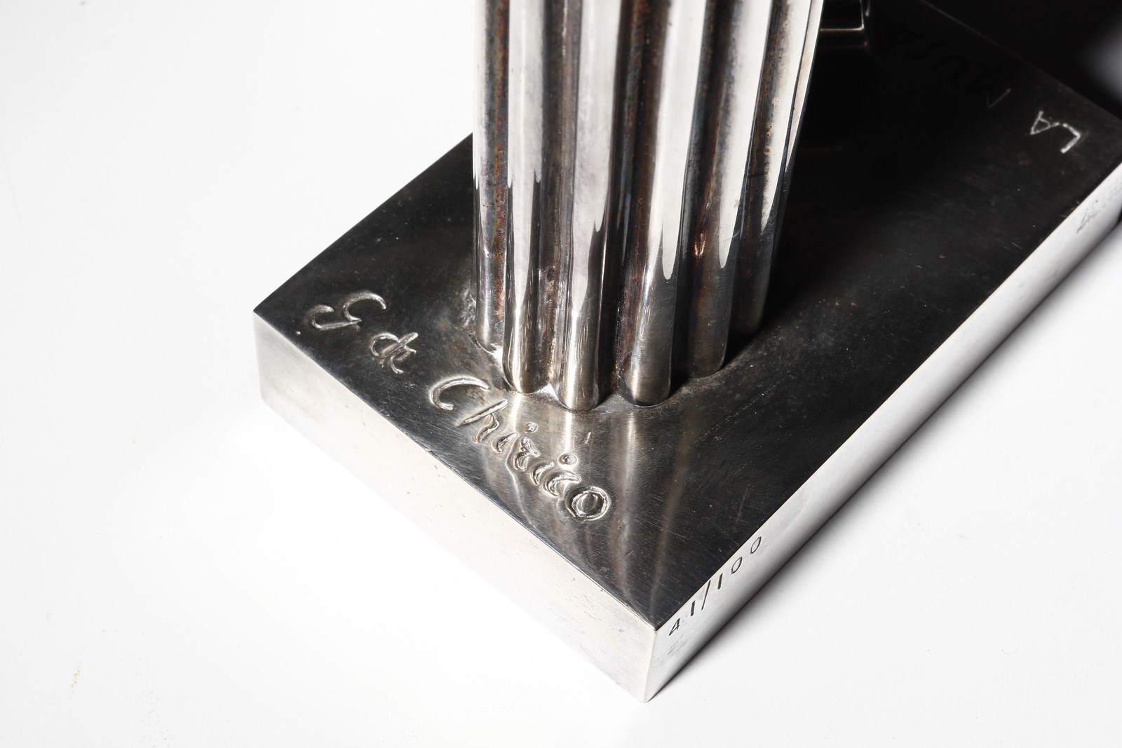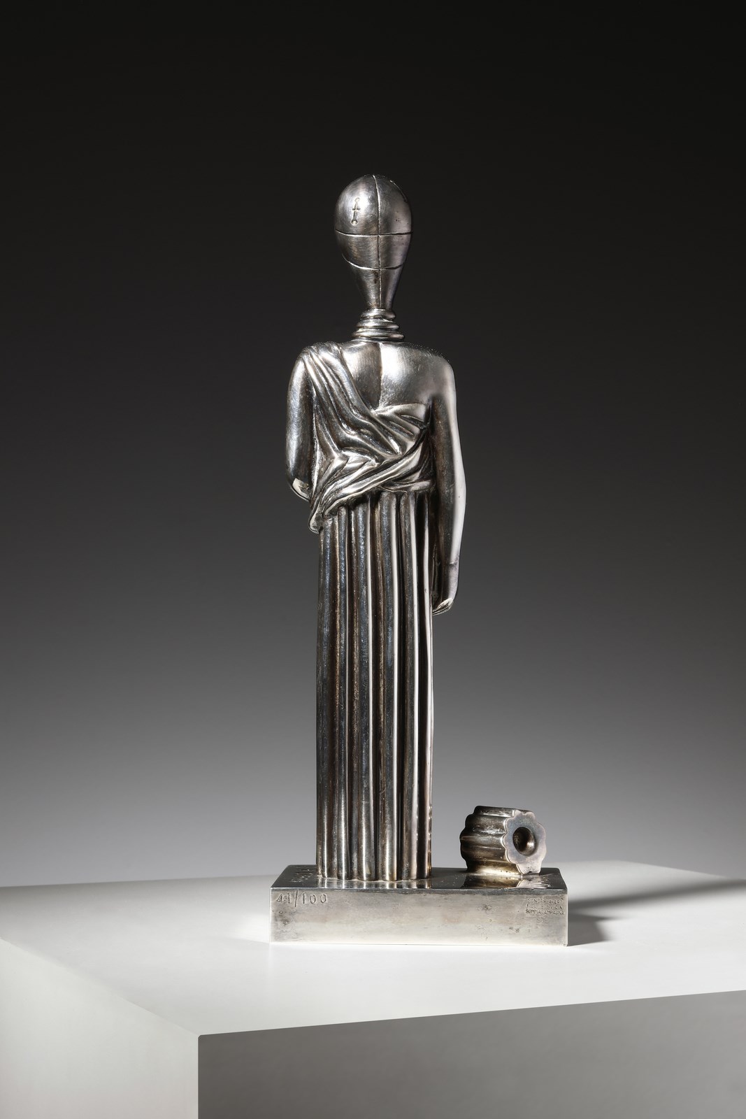 DE CHIRICO GIORGIO (1888 - 1978) Musa con colonna spezzata. 1970. Bronzo argentato. Cm 15,00 x 30,50. 41/100. Titolo, tiratura e firma incisi alla base. La scultura è stata realizzata dalla Fonderia Bonvicini (marchio alla base), Verona, nel 1998 a completamento della tiratura originala su autorizzazione della vedova De Chirico. Confezione originale.