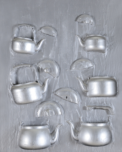 ARMAN Nizza 1928 - New York 22/10/2005 Senza titolo, 1998 pittura acrilica argento e teiere tagliate e applicate su tela tamburata cm. 100x81, firma sul bordo inferiore, timbro della Galleria Carlo Livi (PO) al retro, dichiarazione d'autenticità dell'artista e Archivio delle Opere di Arman a cura della Galleria Dante Vecchiato (PD) su foto, pubblicato su due brochure della Galleria Carlo Livi (PO).