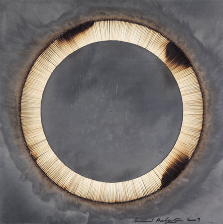 BERNARD AUBERTIN Fontenay aux Roses 1934 Dessin de feu, 2009 fiammiferi e combustioni su alluminio cm. 50x50, firma e anno in basso al centro, dichiarazione d'autenticità dell'artista su foto, pubblicato sul catalogo della mostra "Bernard Aubertin, Fuoco e metallo", tenutasi presso la Galleria Allegrini Arte, pagina 82, entro teca in plexiglass.