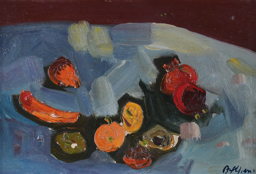 ATTILIO ALFIERI Loreto (An) 15/02/1904 - Milano 20/04/1992 Natura morta, 1966 olio su faesite cm. 37,5x54; firma in basso a destra, dedica ad personam con firma dell'artista al retro.