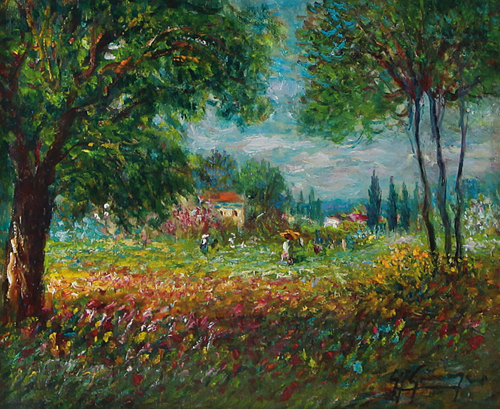 GIOVANFRANCESCO GONZAGA Milano 12/06/1921 - Milano 02/10/2007 Paesaggio lombardo, 1982 olio su tela cm. 24x30, firma in basso a destra, firma, titolo, anno e archivio al retro, dichiarazione d'autenticità dell'artista e archivio a cura della Galleria Il Salotto (MI) su foto, pubblicato sul Catalogo Generale delle Opere di Giovan Francesco Gonzaga, Volume 1, Editoriale Giorgio Mondadori, pagina 151.