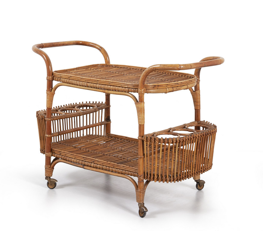 UN CARRELLO-BAR, anni '60. <br>Malacca, giunco e