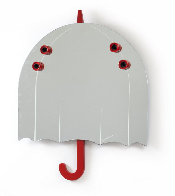 Cristallo argentato, legno laccato, acciaio verniciato.