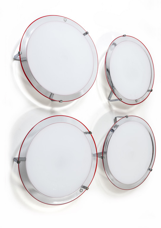 Acciaio cromato, vetro bianco con fascia di cristallo e filo rosso sul bordo.