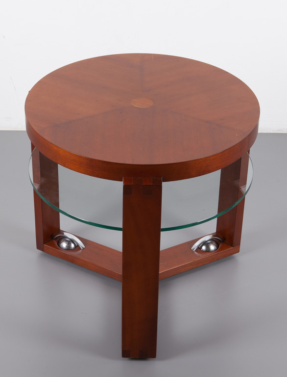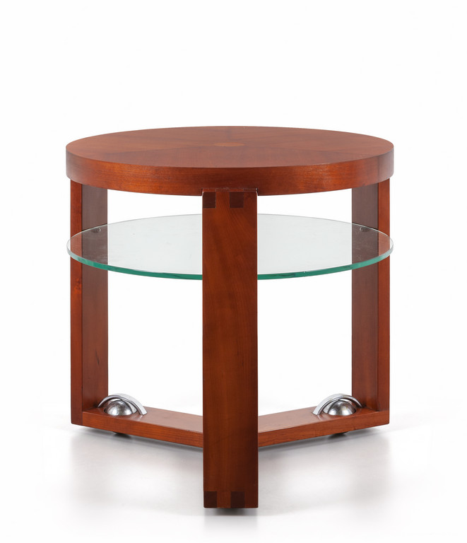 Legno impiallacciato in ciliegio, cristallo, sfere di acciaio cromato.